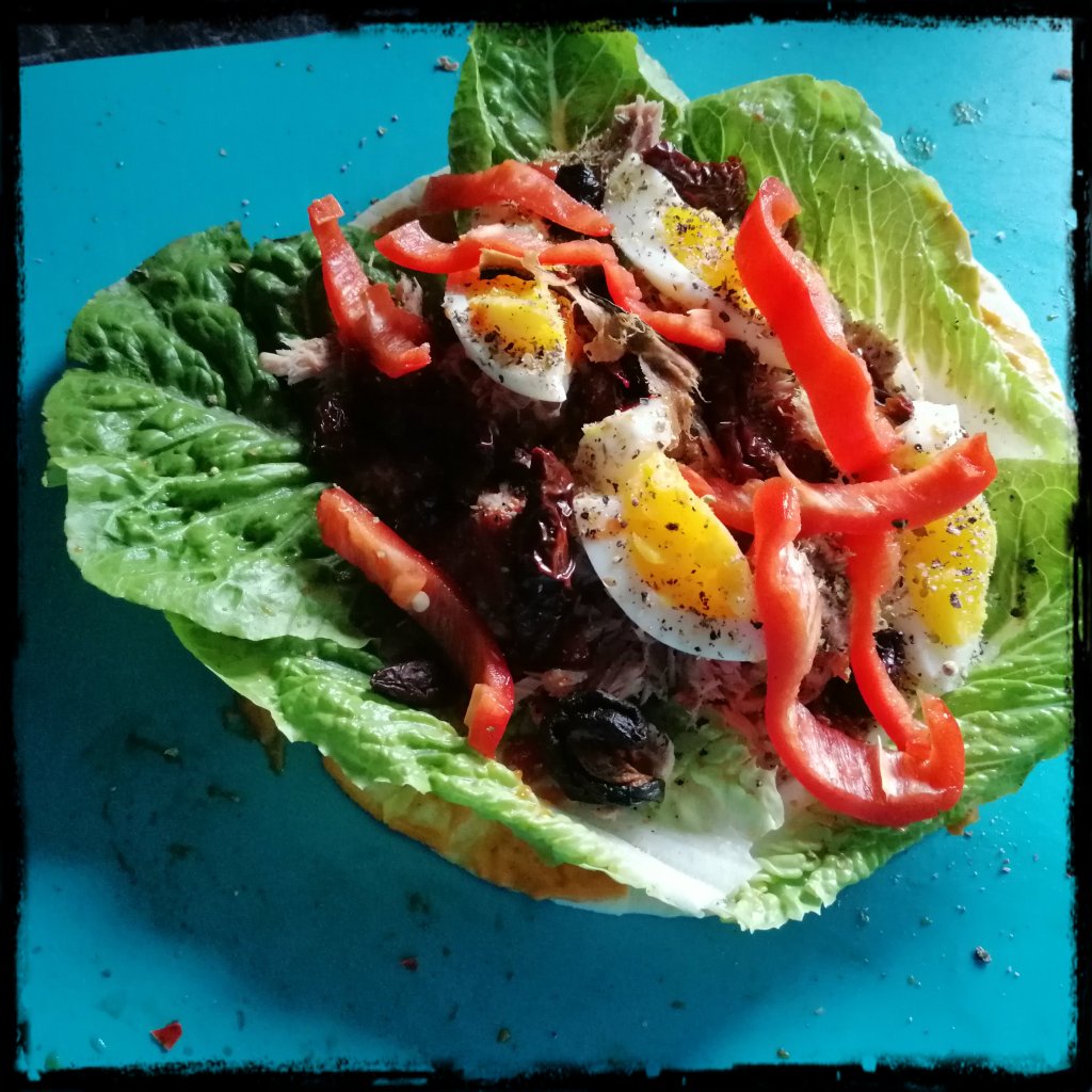 75 g Tunfisch (natur – abgetropft), dem längs geviertelte Ei,