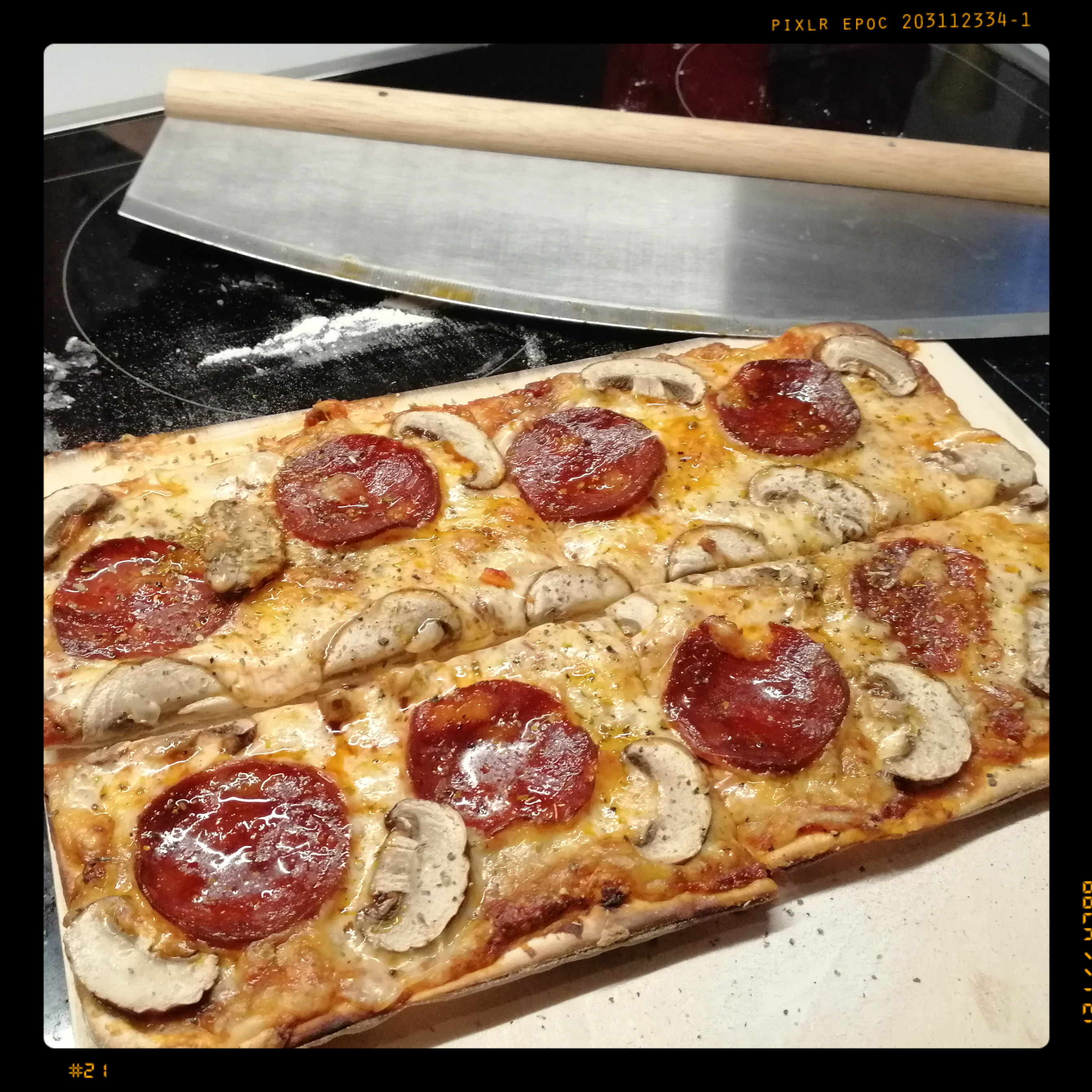 8 dünnen Scheiben Chorizo (ca. 40 g) und den Champignoscheiben belegen und die Pizza auf dem Stein bei 300 Grad ca. 5 1/2 Min., bei 250 Grad ca. 6 1/2 Min. und ohne Stein ca. 11 Min. backen,