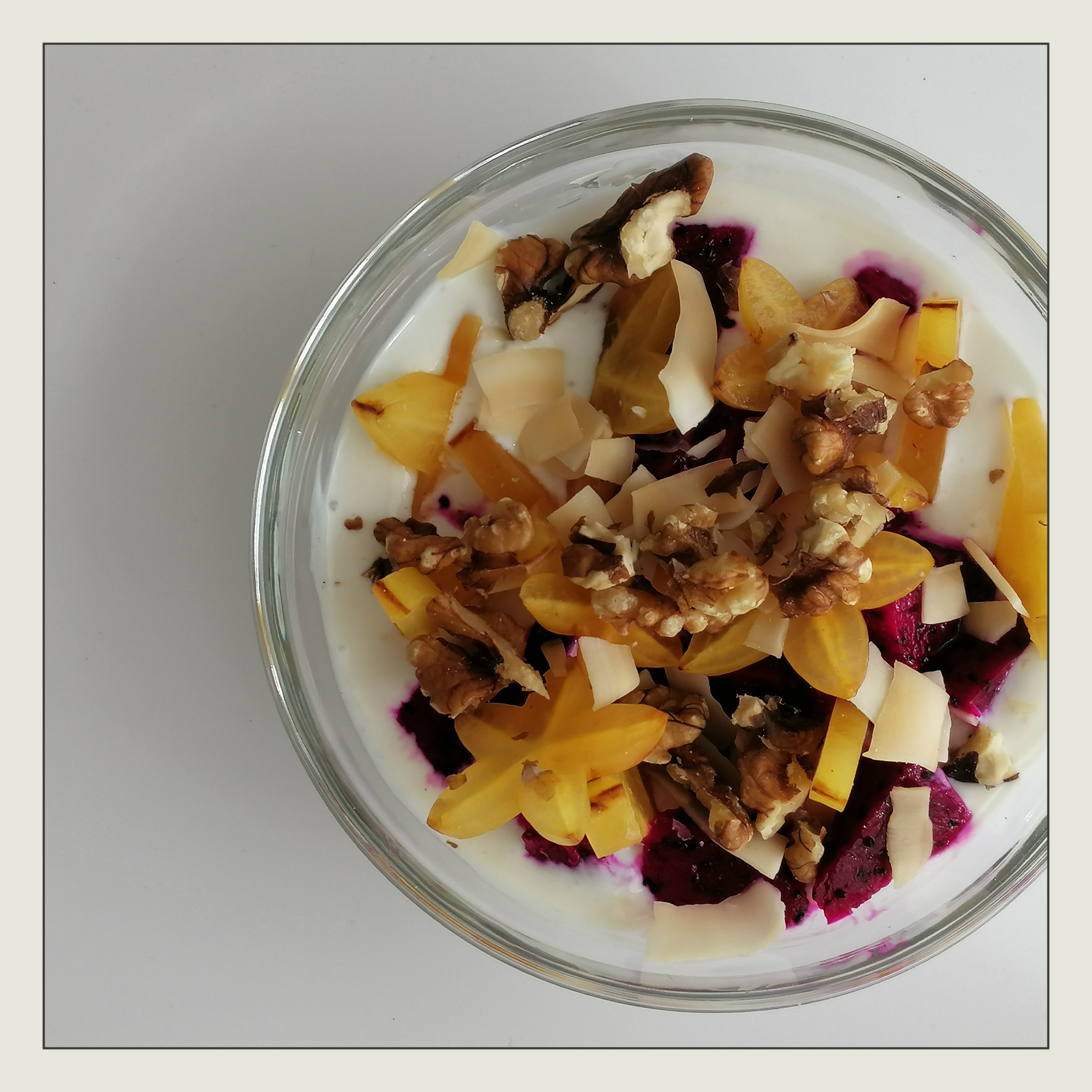 1/2 Karambole (ca. 50 g – in Scheiben geschnitten, die Scheiben ggf. halbiert) darauf verteilen, mit