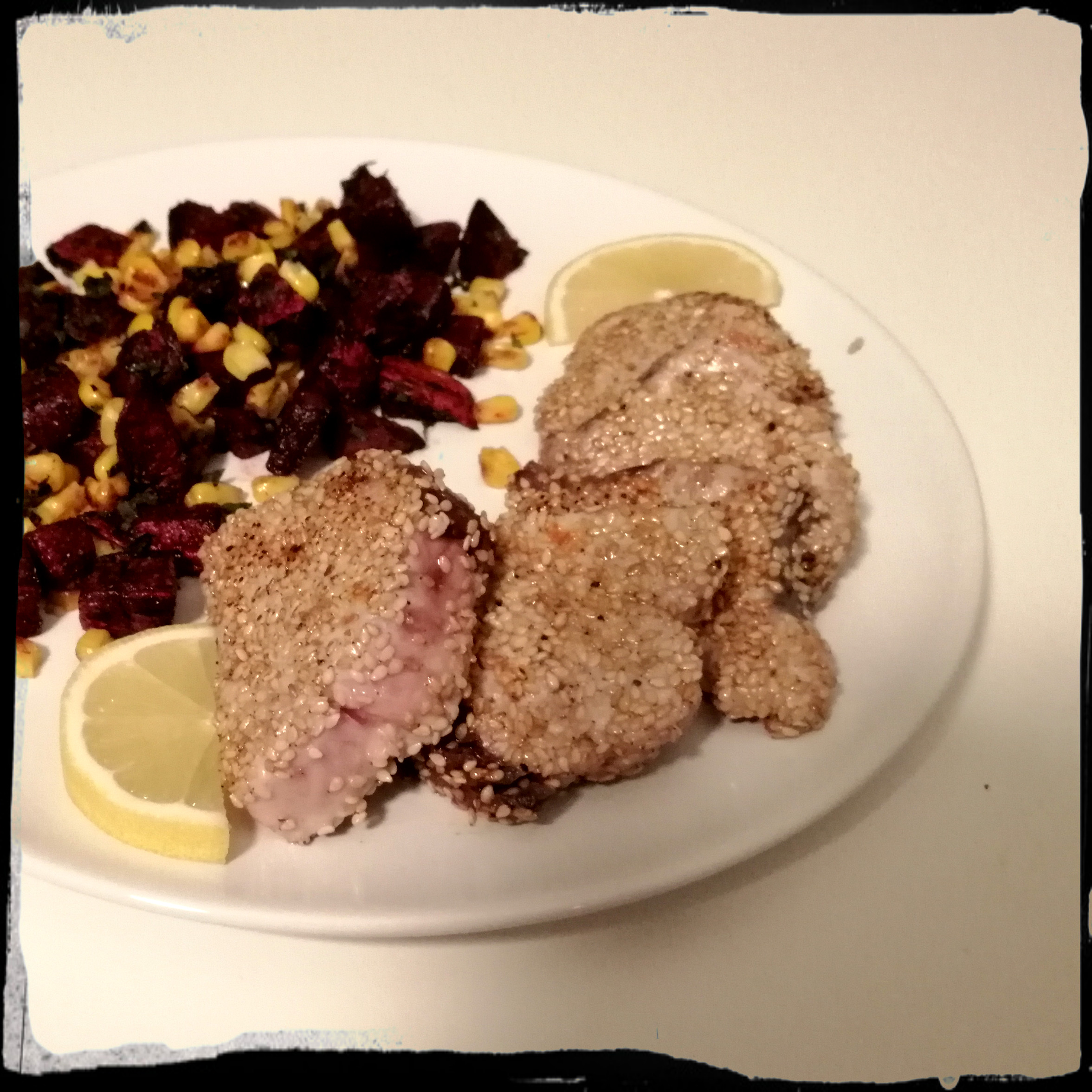 etwa 4 EL Sesam wälzen, dabei den Sesam fest andrücken,