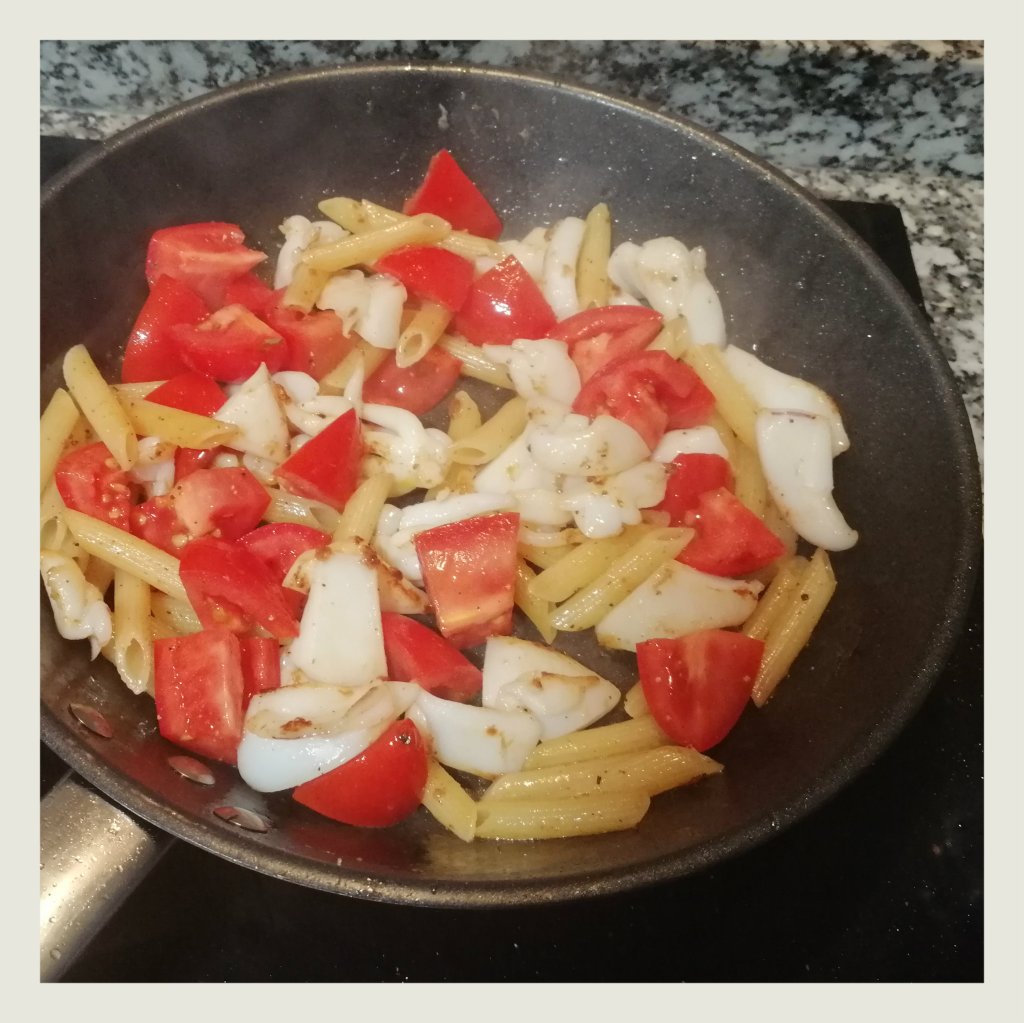 die Penne abgießen, abtropfen lassen und zusammen mit dem Knoblauch zum Sepia geben, alles mit