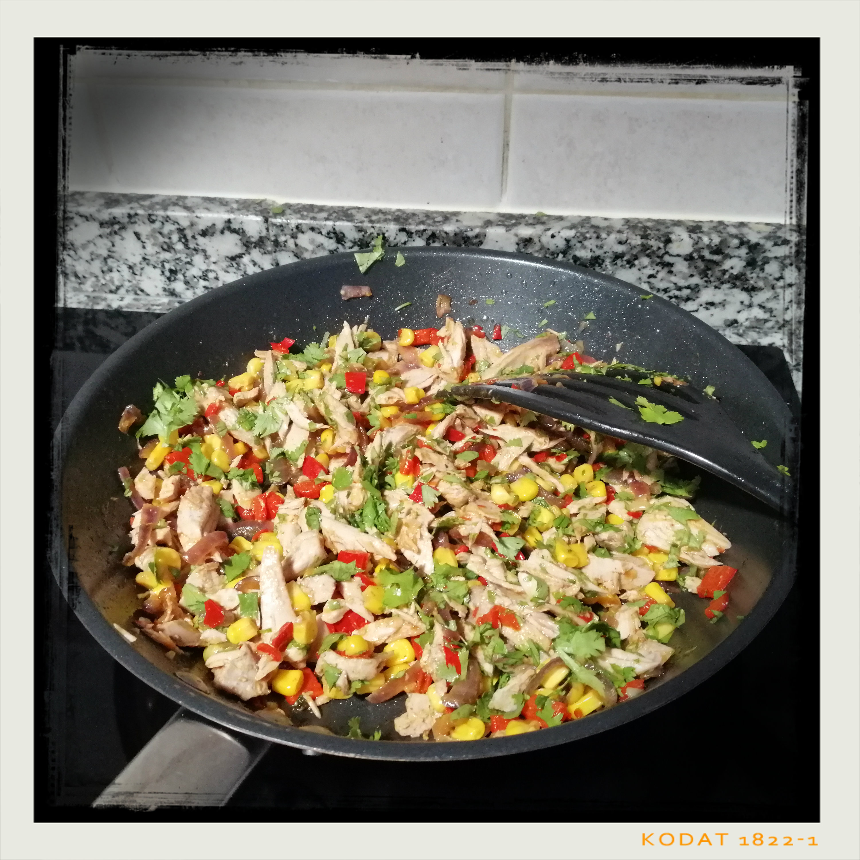 150 g Bonitofilet (alternativ Tunfisch aus der Dose) auf das Gemüse geben und erwärmen, in der Zwischenzeit den Koriander fein hacken