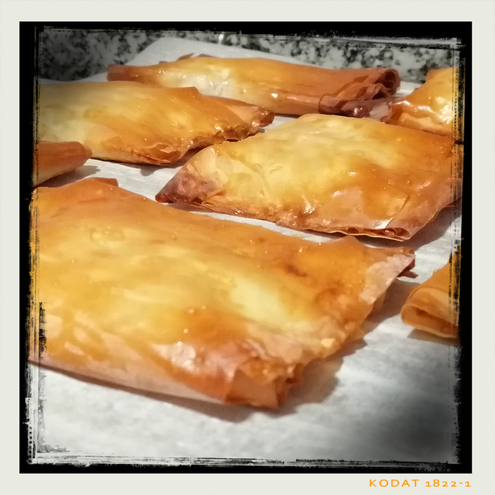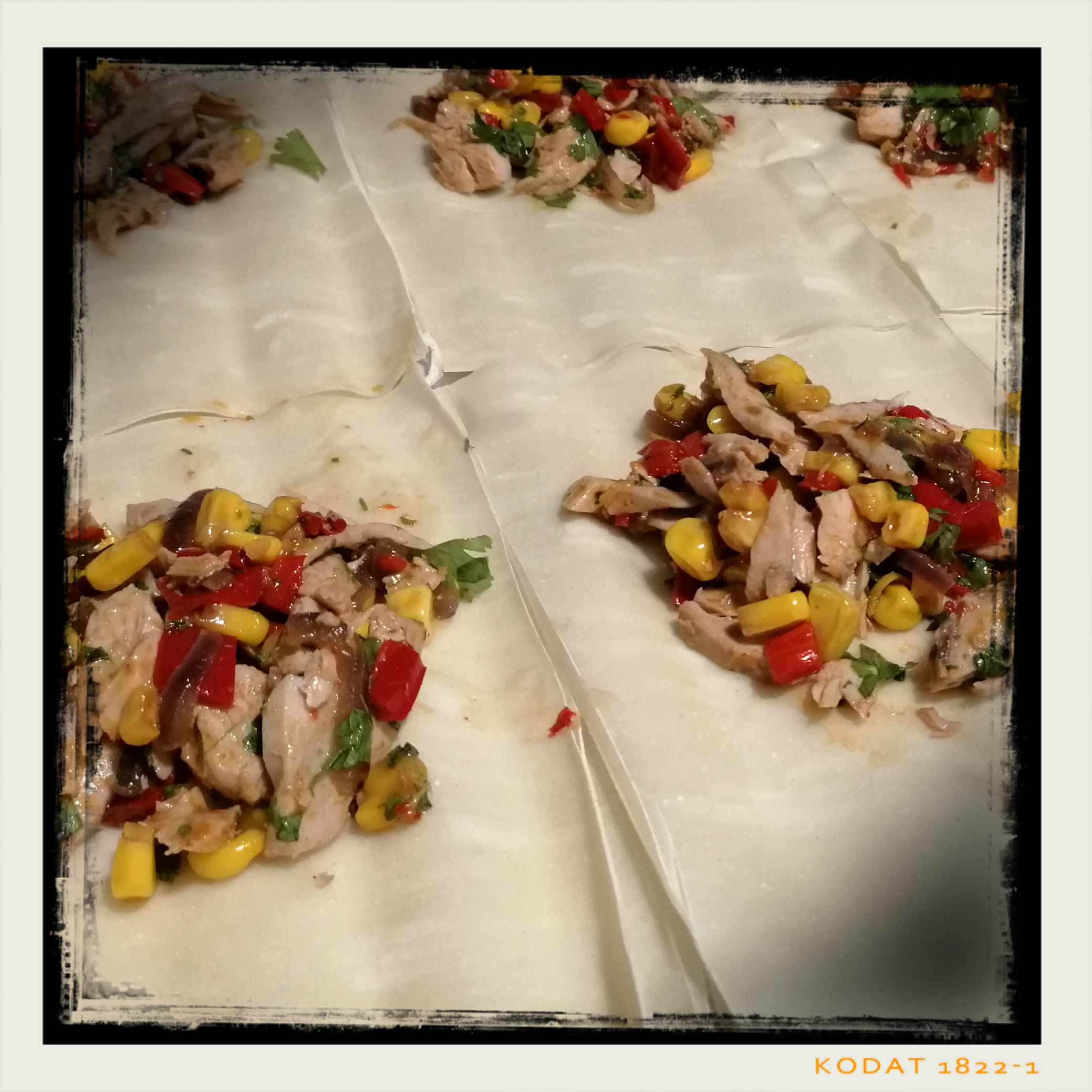 250 g Filoteig (Fertigprodukt, aus dem Kühlregal) in acht Teile teilen und die Gemüse-Fischmischung in Häufchen darauf setzen, die Seiten des Filoteigs mit mit 1 EL Wasser verschlagenem