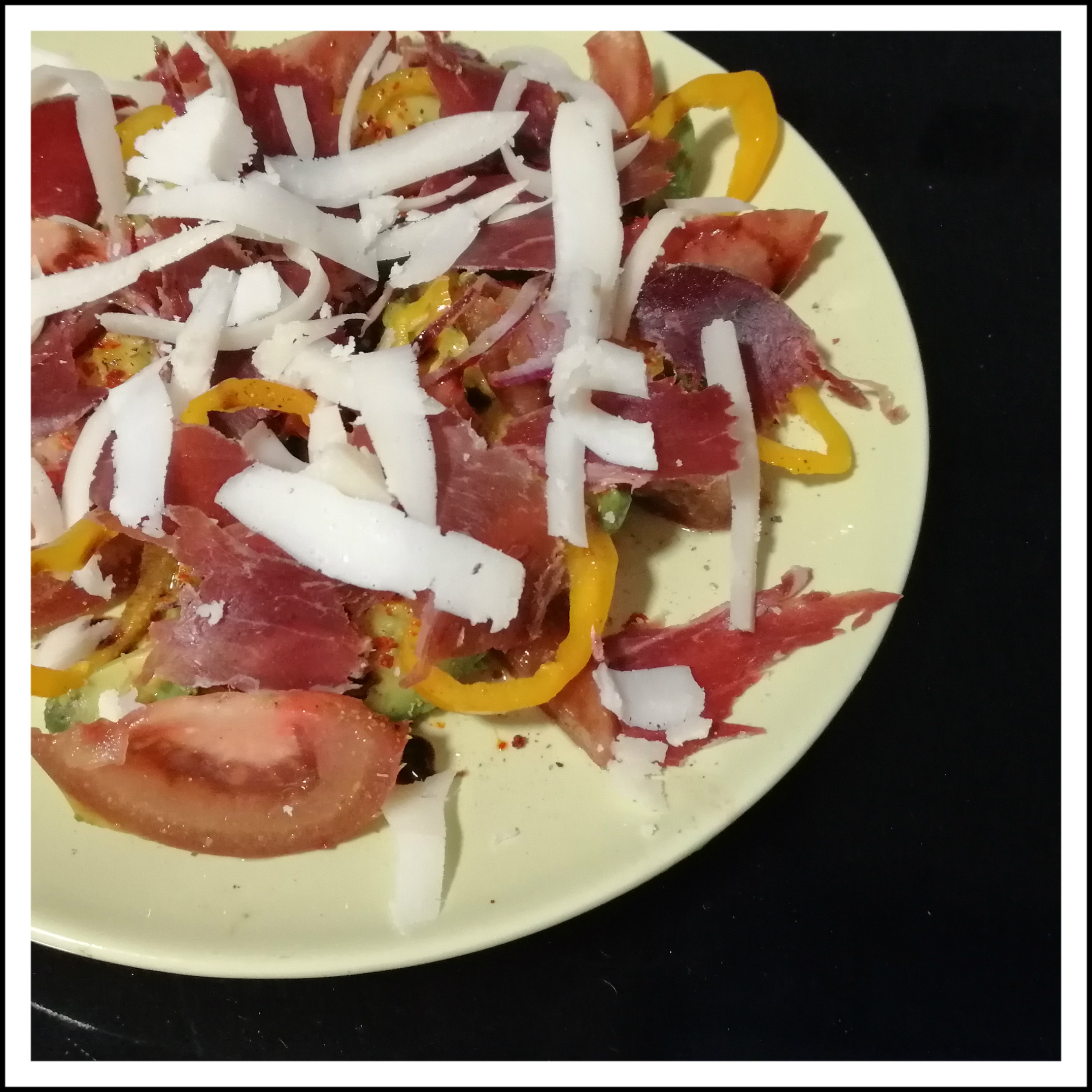 1 kl. Avocado in Spelten schneiden und auf einem großen Teller anrichten,