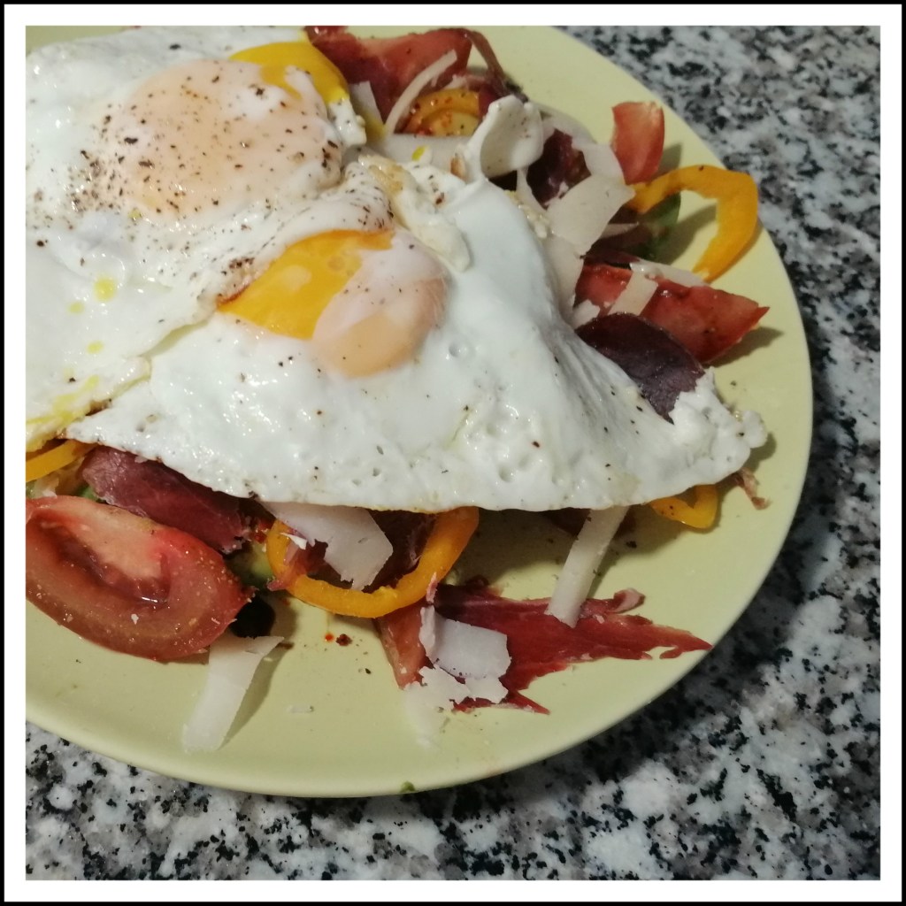 2 Eier (M – L) darin zu Spiegeleiern braten und mit