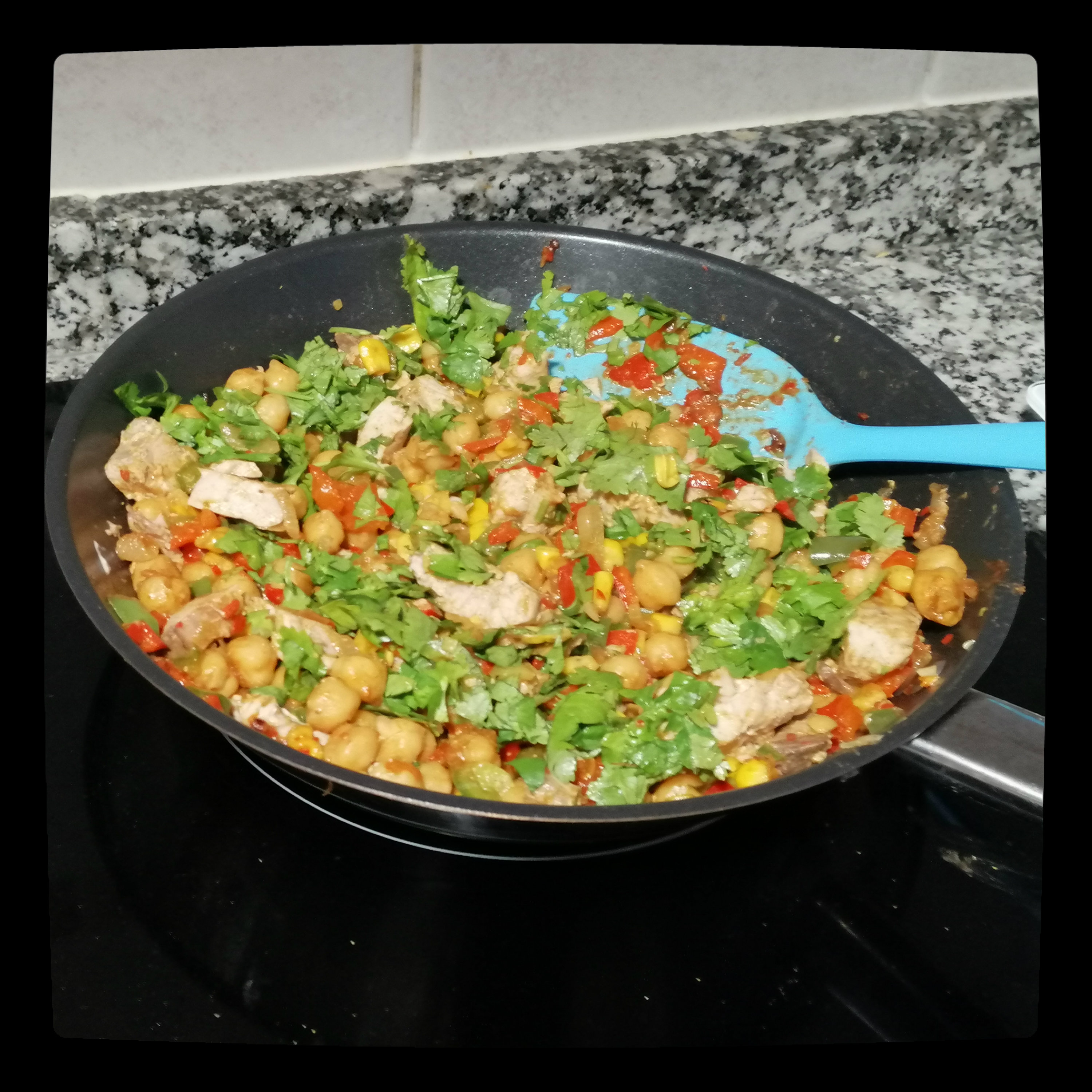 Peperoni, Knoblauch, Paprika, Kichererbsen und Mais sowie