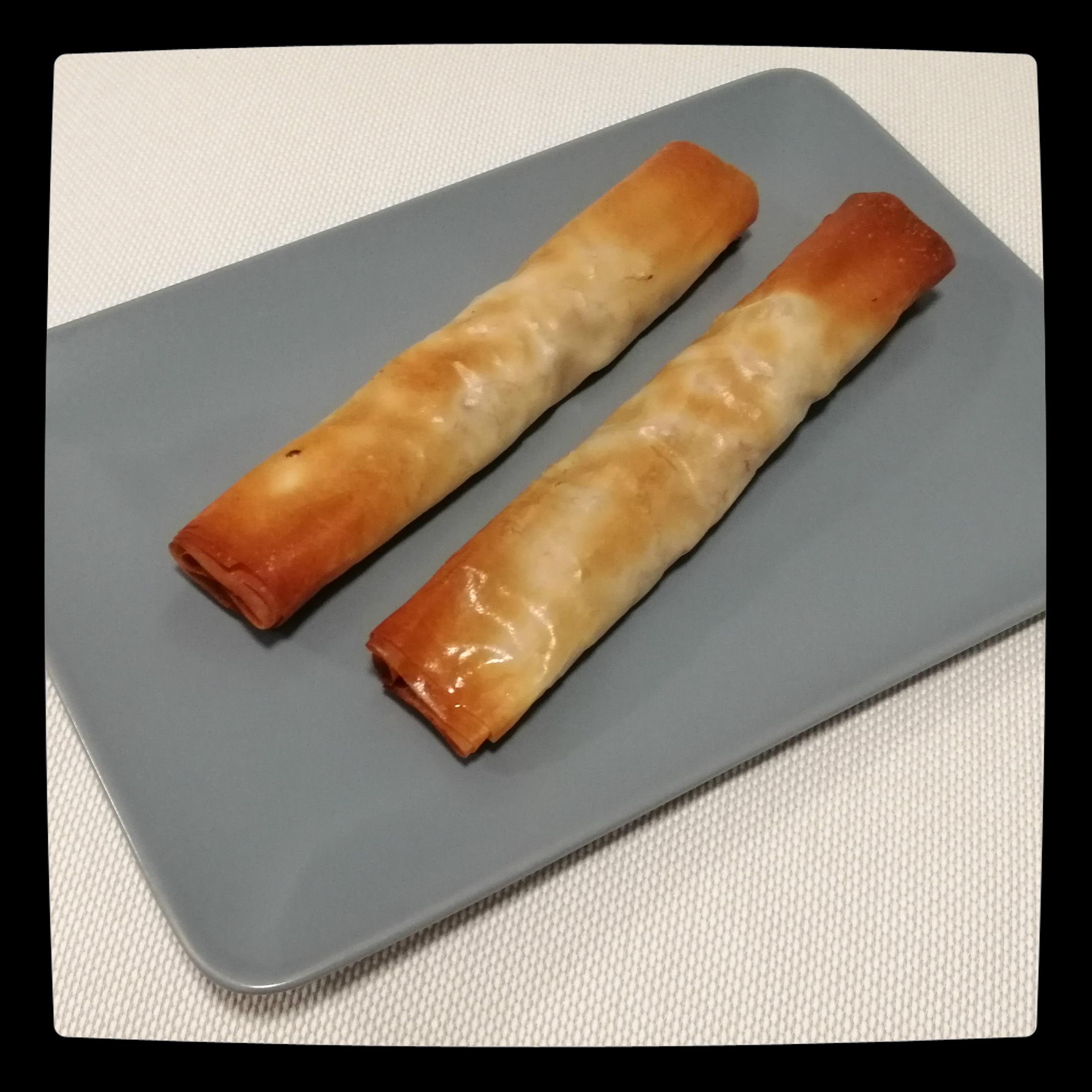 250 g Filoteig (5 Stücke – Fertigprodukt, aus dem Kühlregal) in 10 Stücke teilen (die einzelnen Filoplatten quer halbieren) und je 1/10 der Gemüse-Fischmischung jeweils an einem Ende der kurzen Seite der Filoplatten längs verteilen, dann die Gemüsemischung in die Filoteigstücke einrollen, die Enden leicht zusammendrücken, die Teigrollen mit einer Gabel noch ein paarmal einstechen und mit