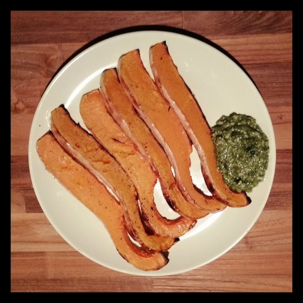 1 Butternut-Kürbis (ca. 1.200 g) entkernen und in 12 Spelten schneiden, von allen Seiten mit