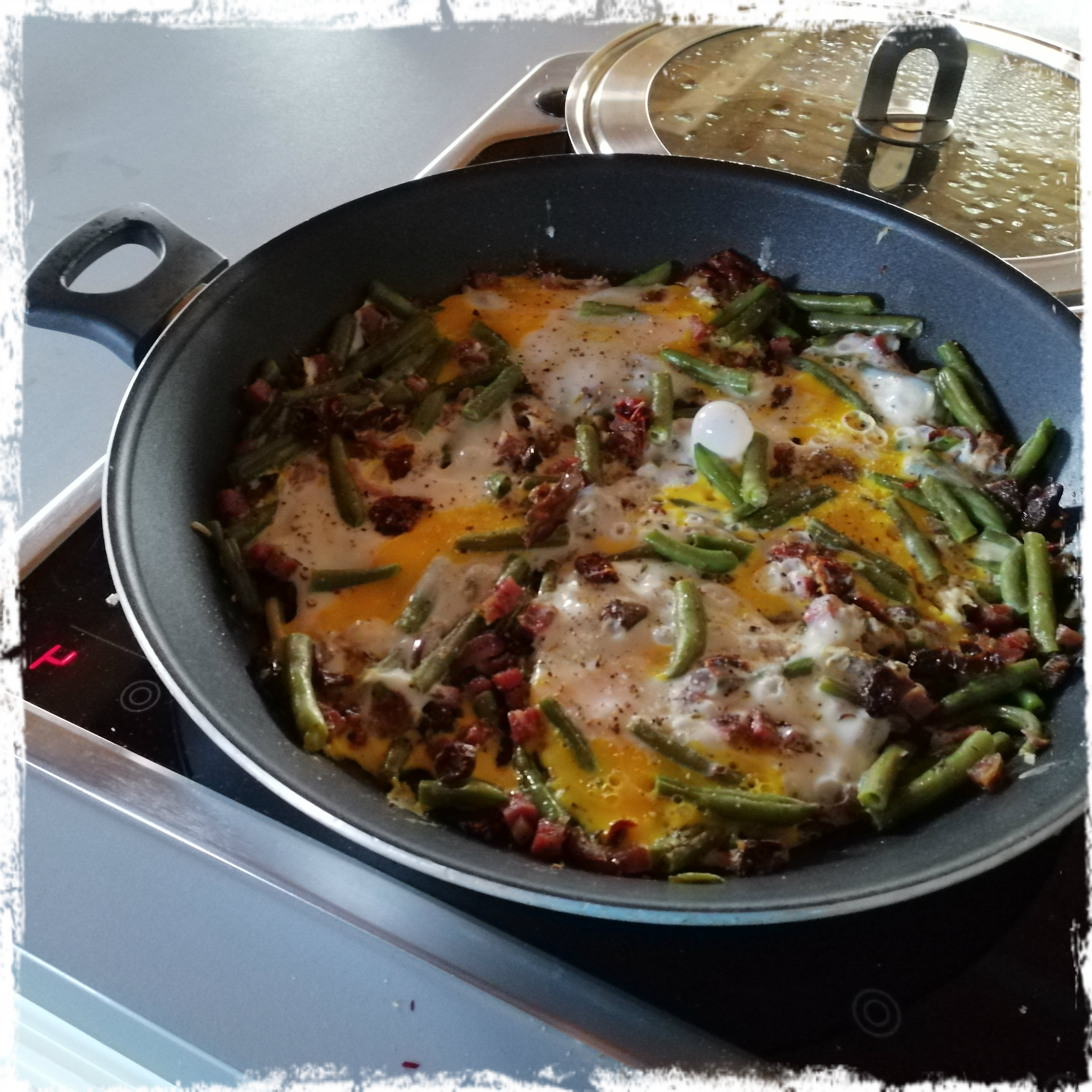 2 EL Olivenöl bei mittlerer Hitze kurz anschwitzen, dann die Bohnen hinzugeben und unter dem Deckel bei mittlerer bis mittelschwacher Hitze ca. 10 Min. dünsten, derweil