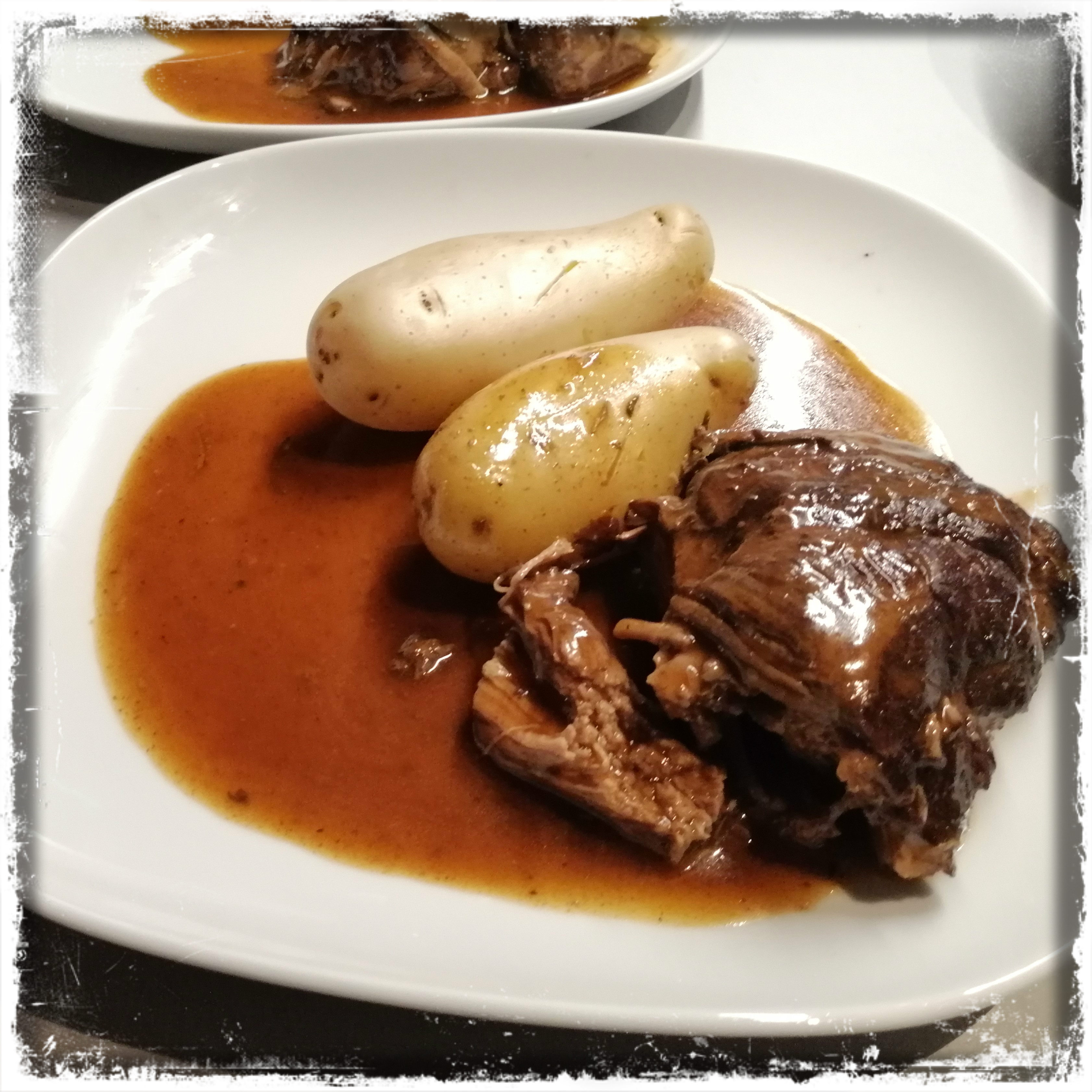 1 Zitrone zum Fleisch geben, dann alles bei mittelschwacher Hitze 2 – 1/2 Stunden schmoren, ab und zu wenden, zwischendurch nach und nach weitere