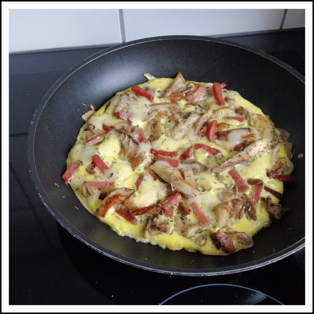 1 EL Brat-Olivenöl einfetten, dann die verschlagenen Eier hineingießen und die Austernpilzmischung darauf verteilen, zum Schluss den Bergkäse darüberstreuen, die Pfanne mit dem Deckel schließen und alles ca. 5 Min. braten, bis das Omelett gestockt und der Käse zerlaufen ist