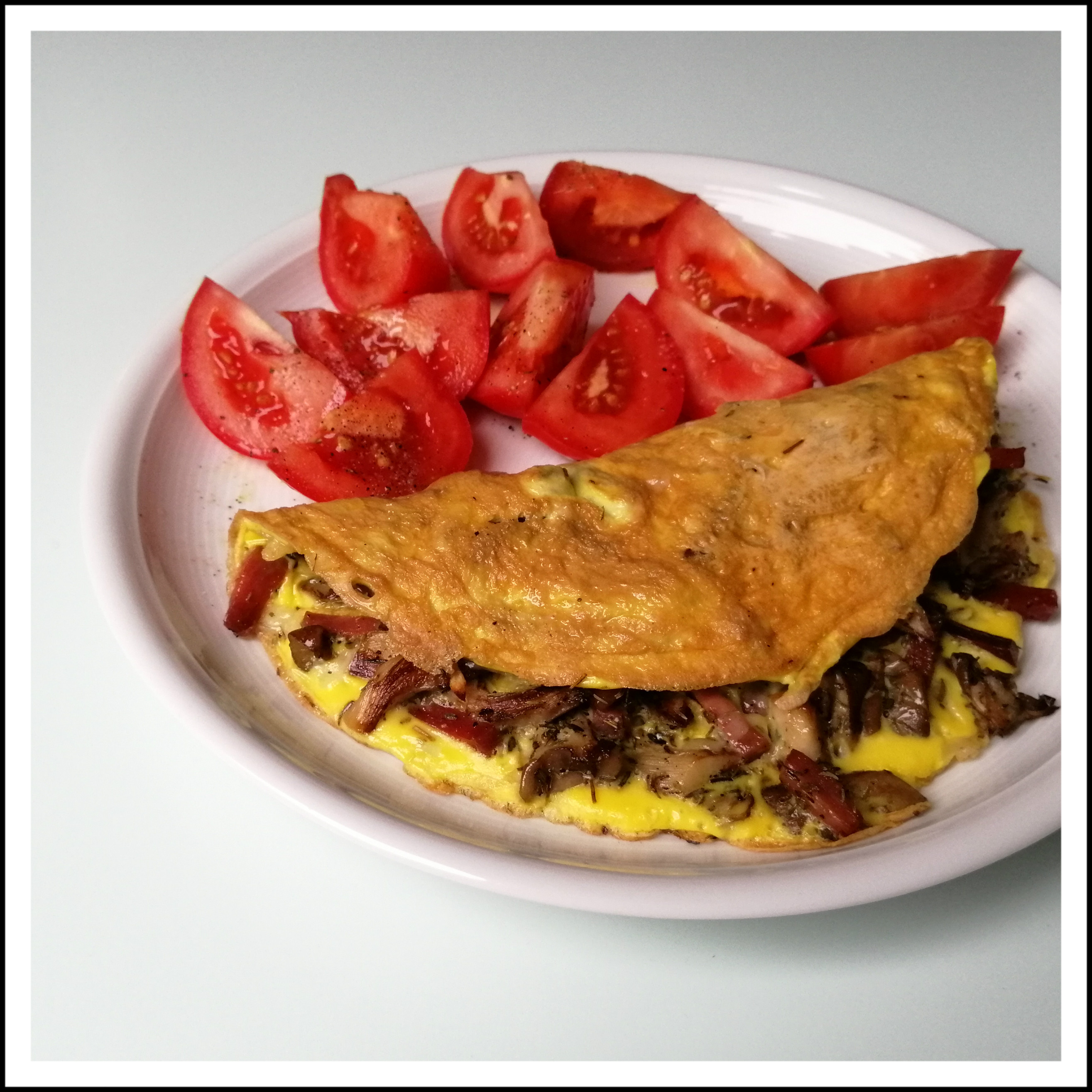 das Omelett einmal zusammenklappen und auf einem vorgewärmten Teller z. B. mit ein paar Tomaten (geviertelt und gewürzt) servieren