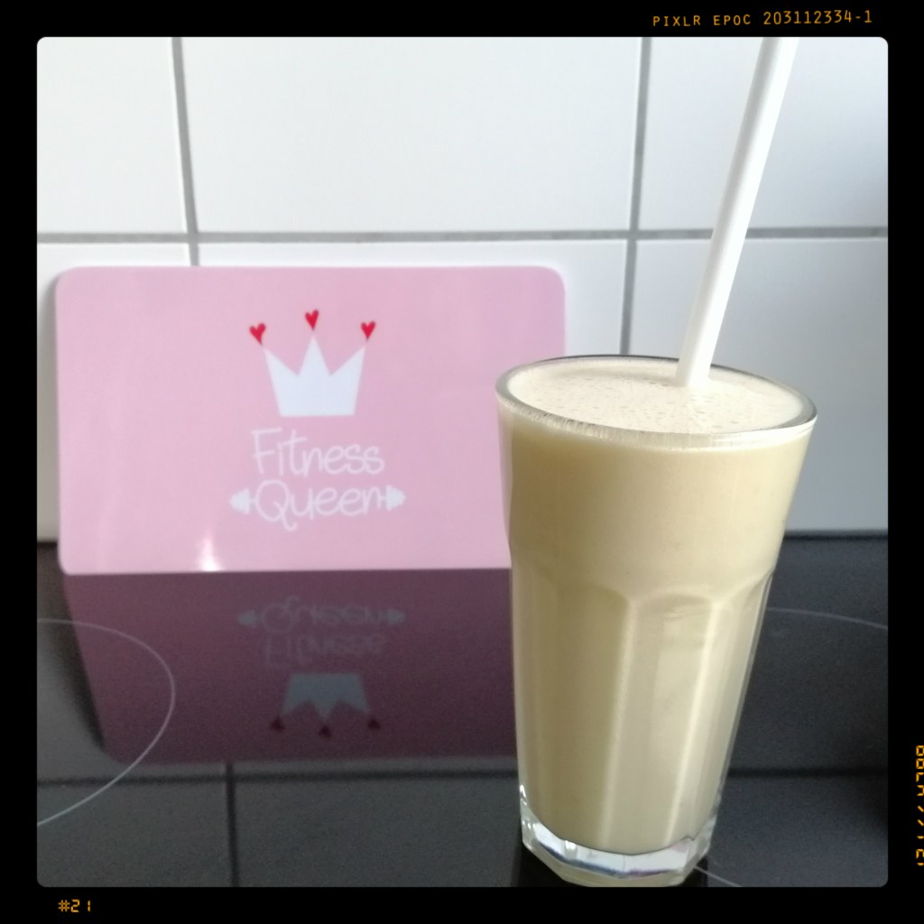 2 Eiswürfeln mit dem Mixstab oder im Mixer zu einem Shake verarbeiten, mit