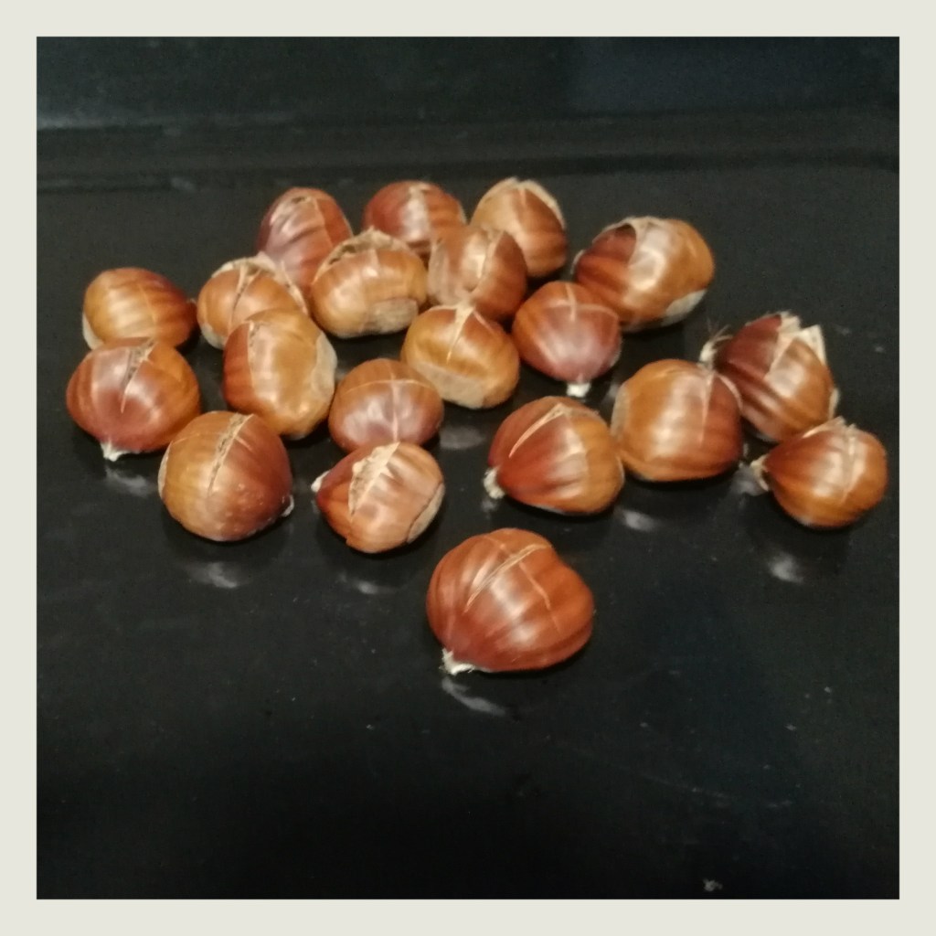 8 Esskastanien (oder mehr zum so essen) auf der gewölbten Seite kreuzweise einritzen und auf dem Backblech ausbreiten, nach ca. 20 Min. sind die Kastanien aufgeplatzt und können aus dem Ofen genommen werden, die Kastanien kurz abkühlen lassen und von der Schale befreien, dann leicht zerkleinern