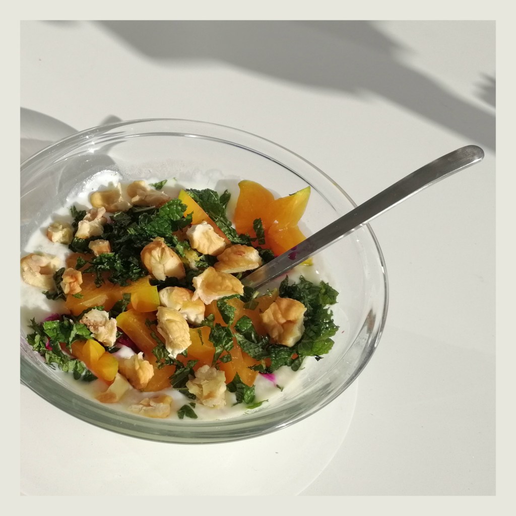 150 g Ziegenjoghurt mit dem Saft und der abgeriebenen Schale von