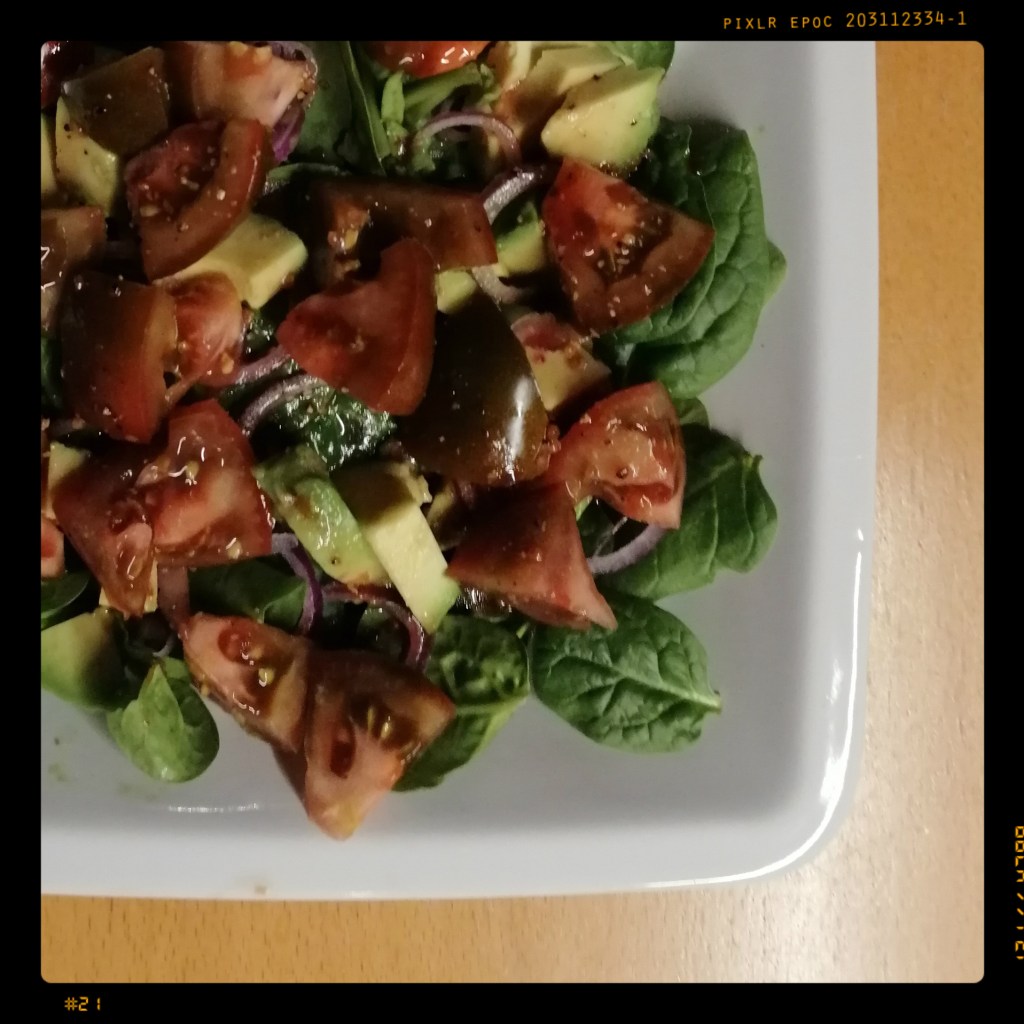 1 Avocado (in Stücke geschnitten) auf zwei tiefen Tellern verteilen und mit einem Dressing aus