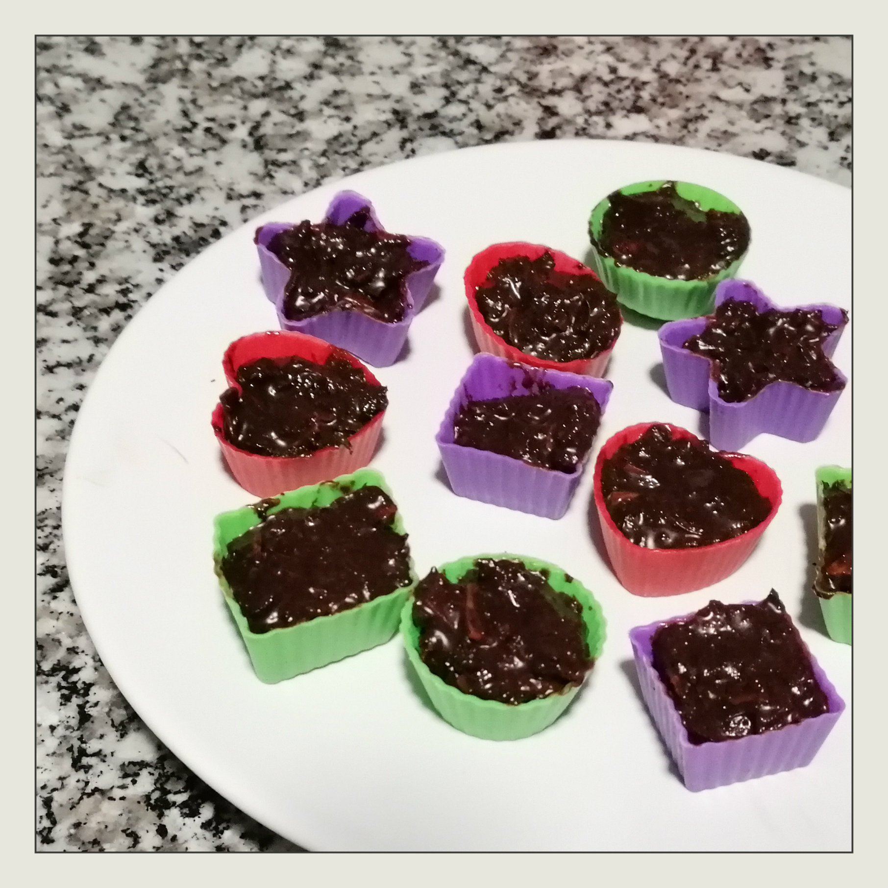 30 g Kokosöl (geschmolzenes) einrühren, dann die Kokoschips sowie die Minze unterrühren und die Masse in die Pralinenförmchen füllen (alternativ geht auch eine Form für kleine Eiswürfel)