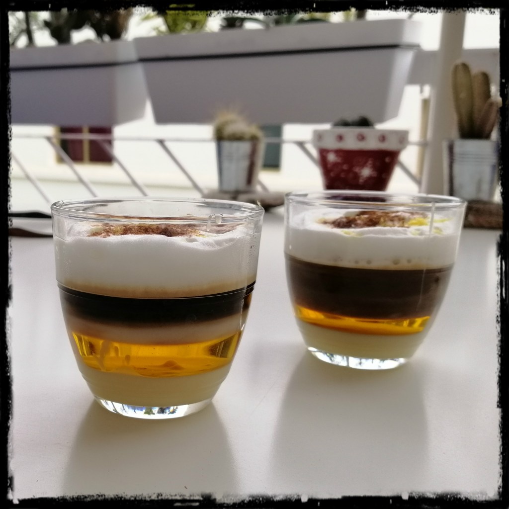 1 Café solo (Espresso) direkt aus der Maschine durch den Milchschaum in das Glas laufen lassen (je cremiger der Espresso aus der Maschine kommt, umso weniger mischen sich die einzelnen Komponenten), zum Schluss