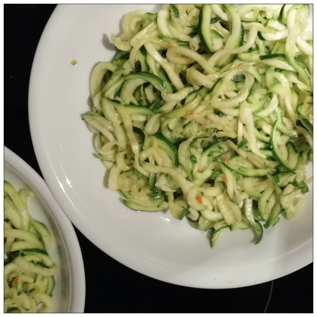 500 g Zucchini mit dem Spiralschneider zu Spaghetti verarbeiten und unter Zugabe von