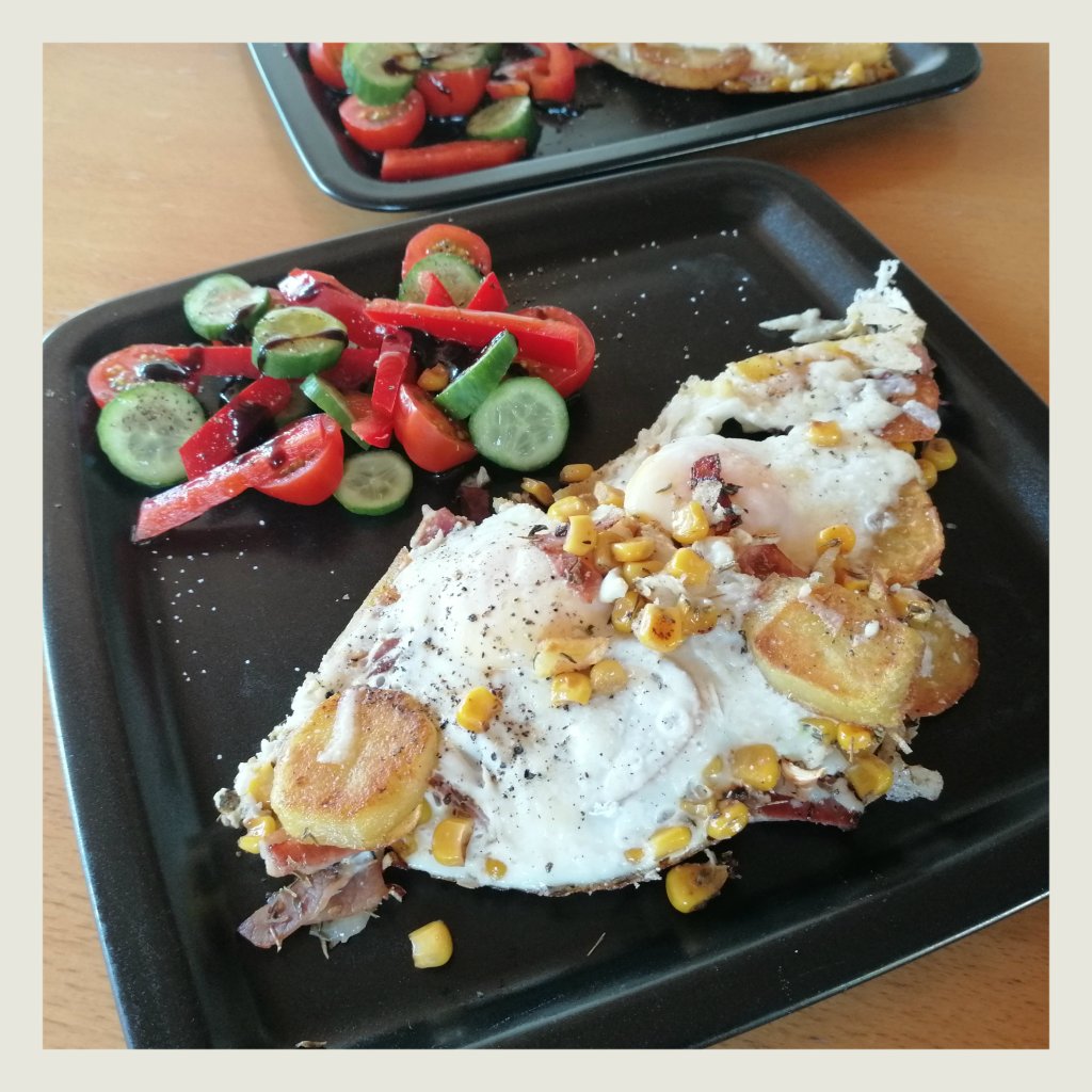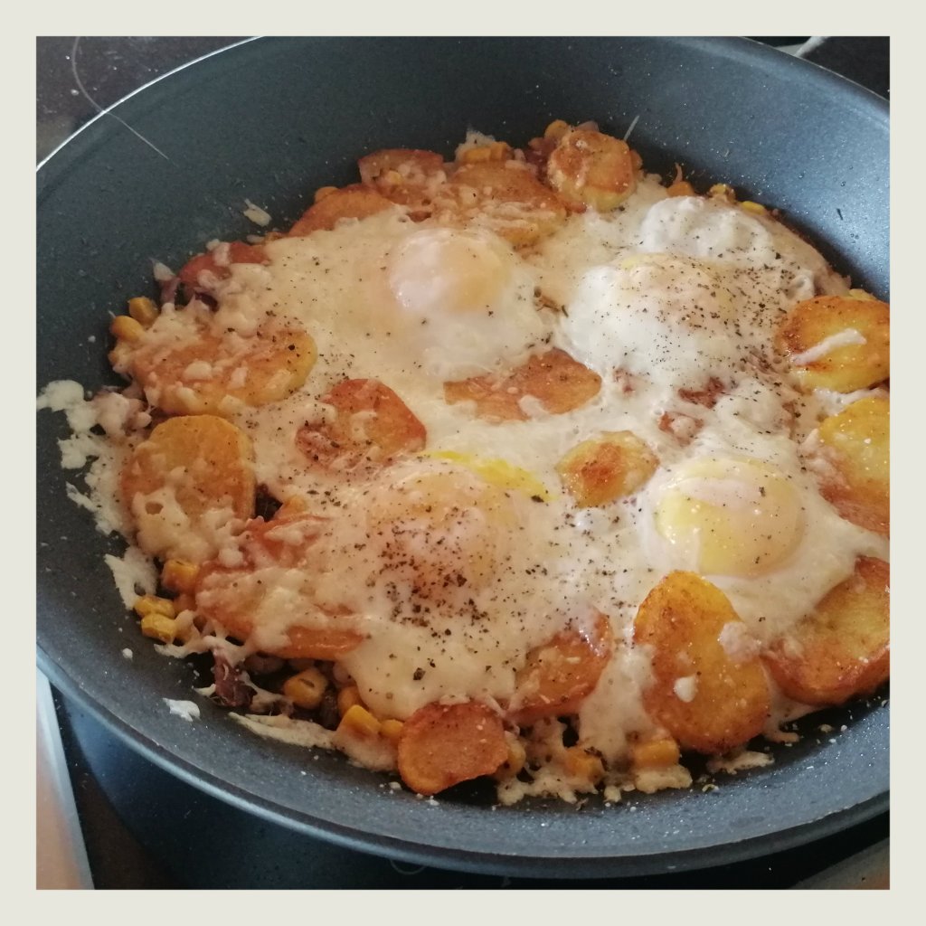 1 EL Brat-Olivenöl bei mittlerer Hitze kurz andünsten, dann den Mais hinzufügen und bei schwacher Hitze etwa 5 Minuten weiter dünsten, auf mittlere Hitze heraufschalten, den Schinken hinzufügen und in der offenen Pfanne kurz anbraten, die Kartoffeln wieder hinzufügen, alles mit
