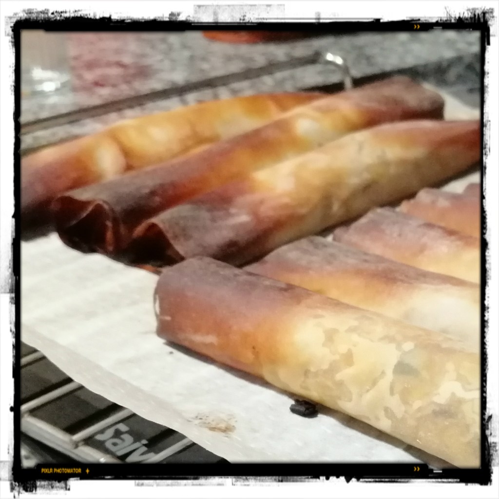 250 g Filoteig (5 Stücke – Fertigprodukt, aus dem Kühlregal) in 10 Stücke teilen (die einzelnen Filoplatten quer halbieren) und je 1/10 der Gemüse-Fischmischung jeweils an einem Ende der kurzen Seite der Filoplatten längs verteilen, dann die Gemüse-Fischmischung in die Filoteigstücke einrollen, die Enden leicht zusammendrücken und mit