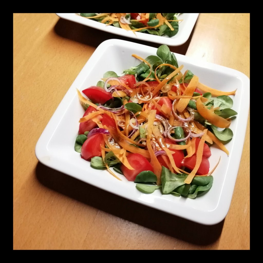 1 kl. Möhre (mit dem Sparschäler in Streifen gehobelt) auf den Feldsalat geben,