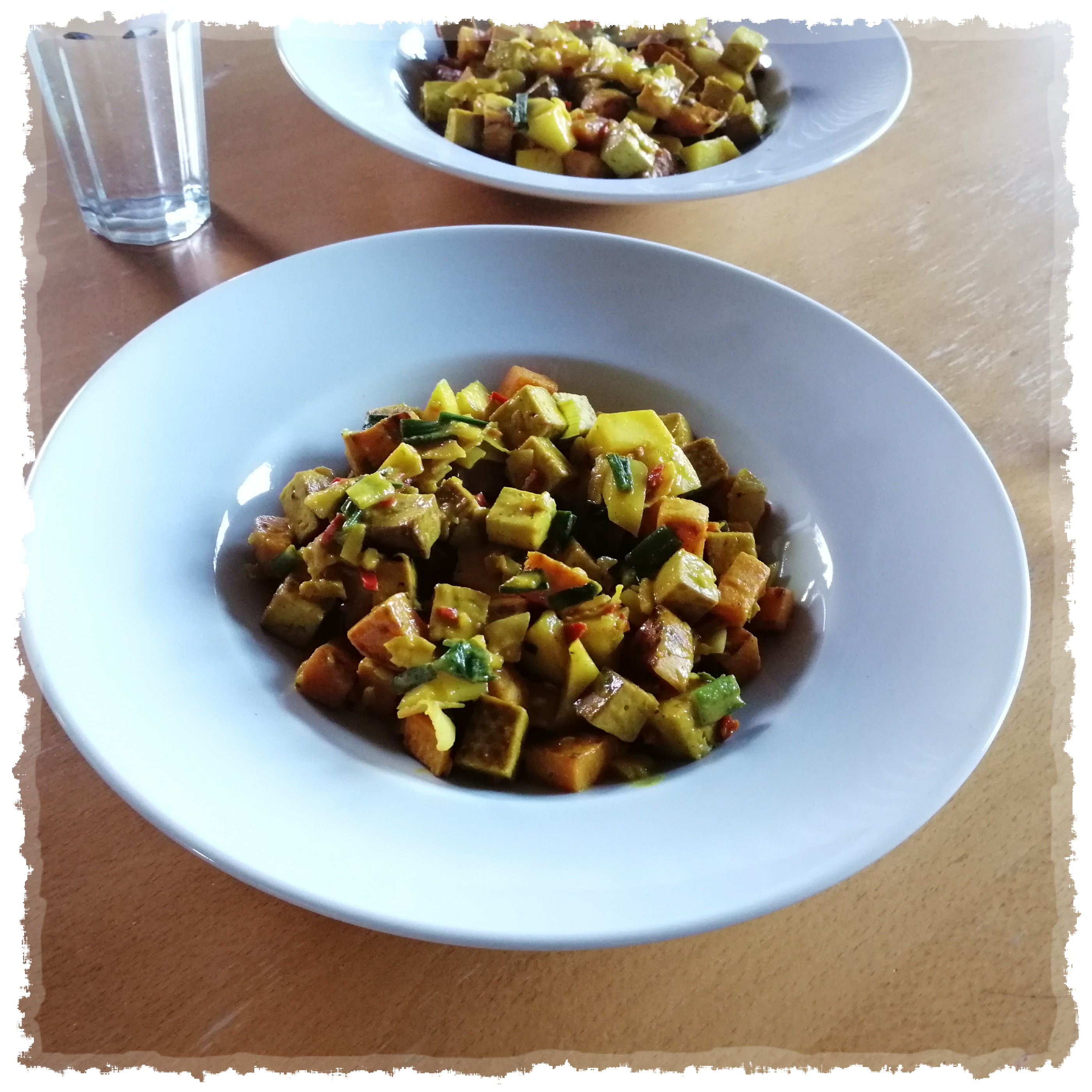 ca. 75 ml Wasser, die Mango, das Grüne der Frühlingszwiebeln und den Tofu hinzugeben, alles etwa 5 Min. köcheln lassen, dann die Süßkartoffeln wieder untermischen und