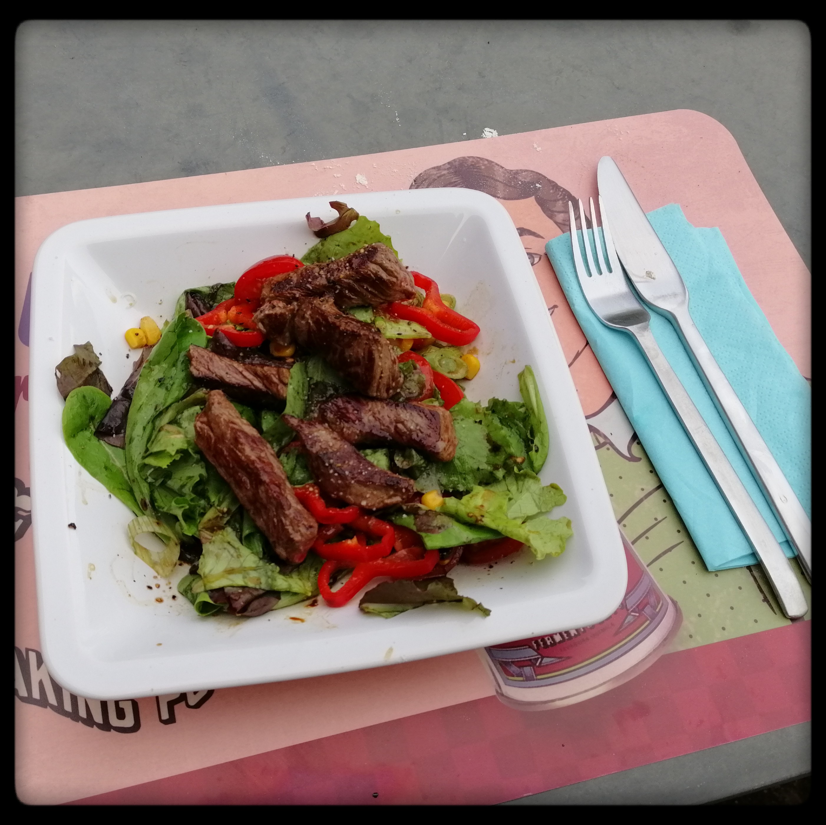 180 g Rumpsteak in Streifen von ca. 1 – 1,5 cm Dicke schneiden und in einer Pfanne bei starker Hitze in