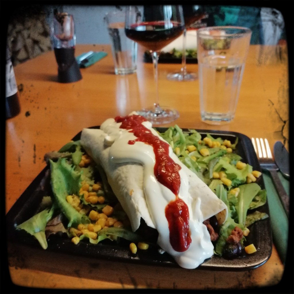 2 große Weizen-Tortilla-Fladen in einer großen Pfanne bei mittlerer Hitze im Wechsel von beiden Seiten erwärmen mit der Bohnen-Mischung füllen und in die Mitte der Teller legen, den Schmand darauf verteilen und