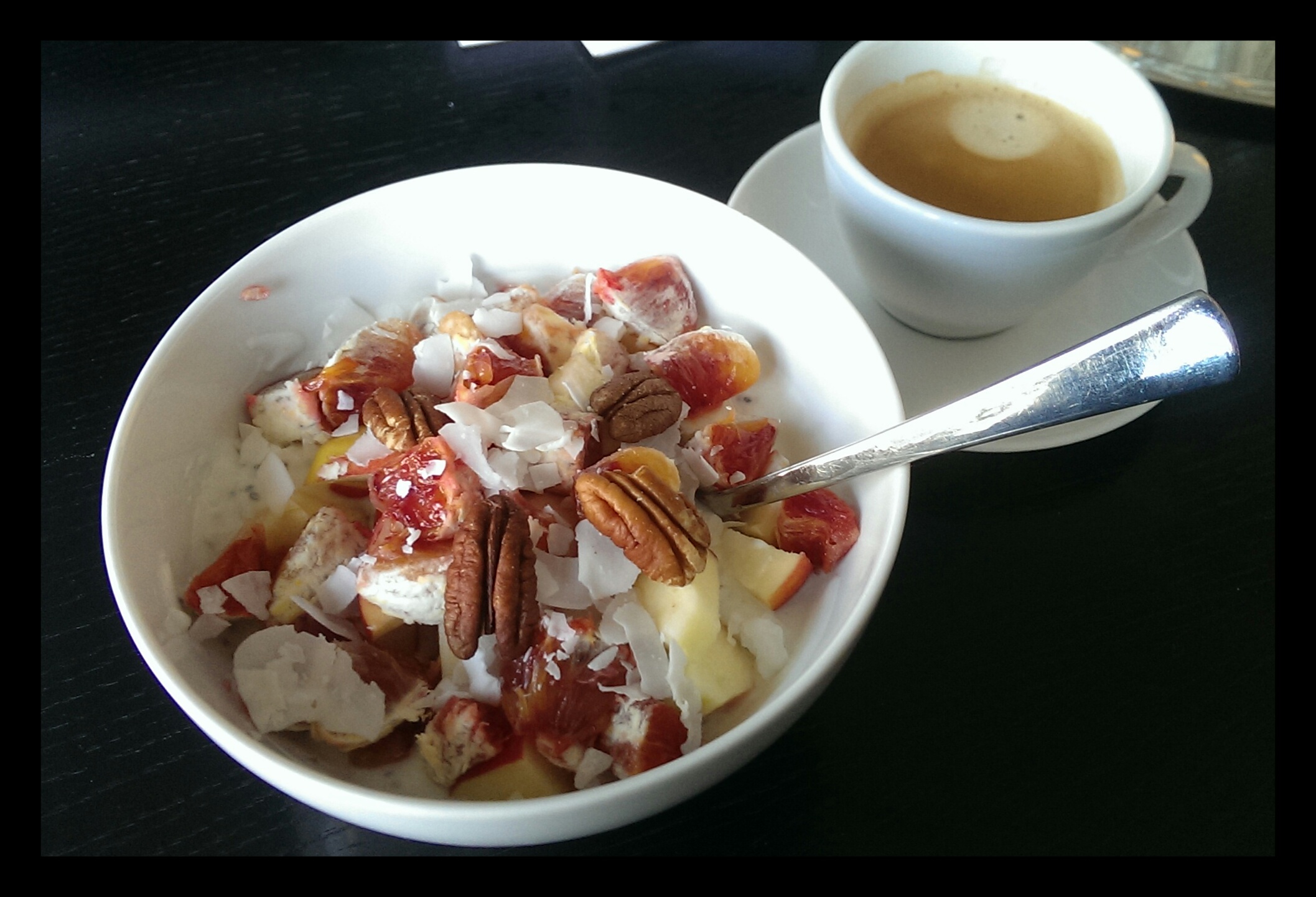 1 Blutorange schälen, klein schneiden und auf den Joghurt geben, mit