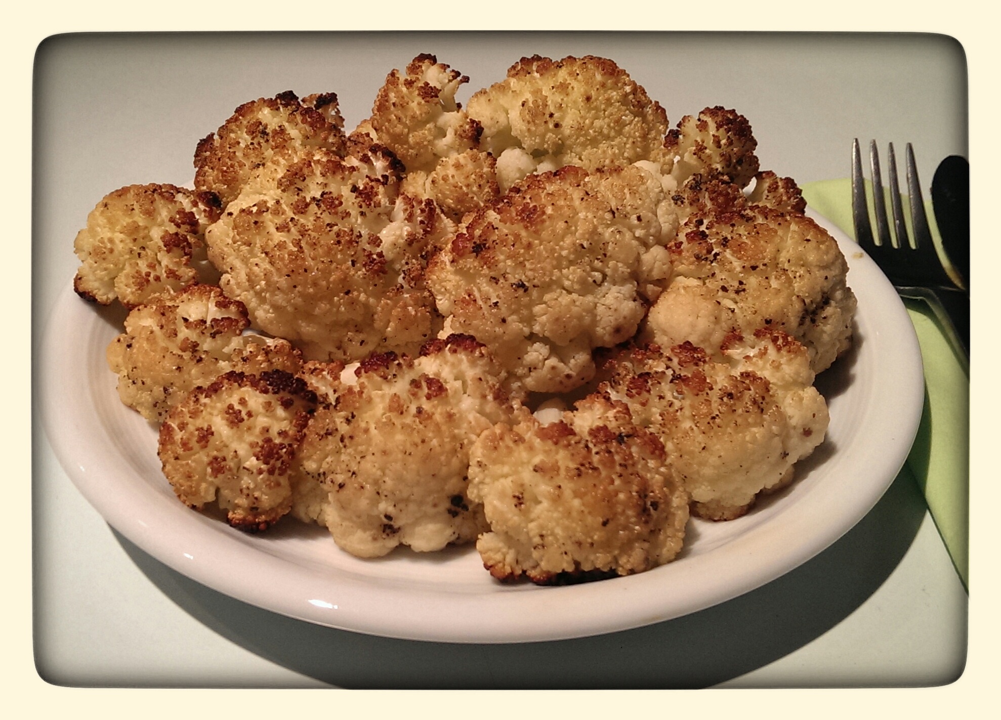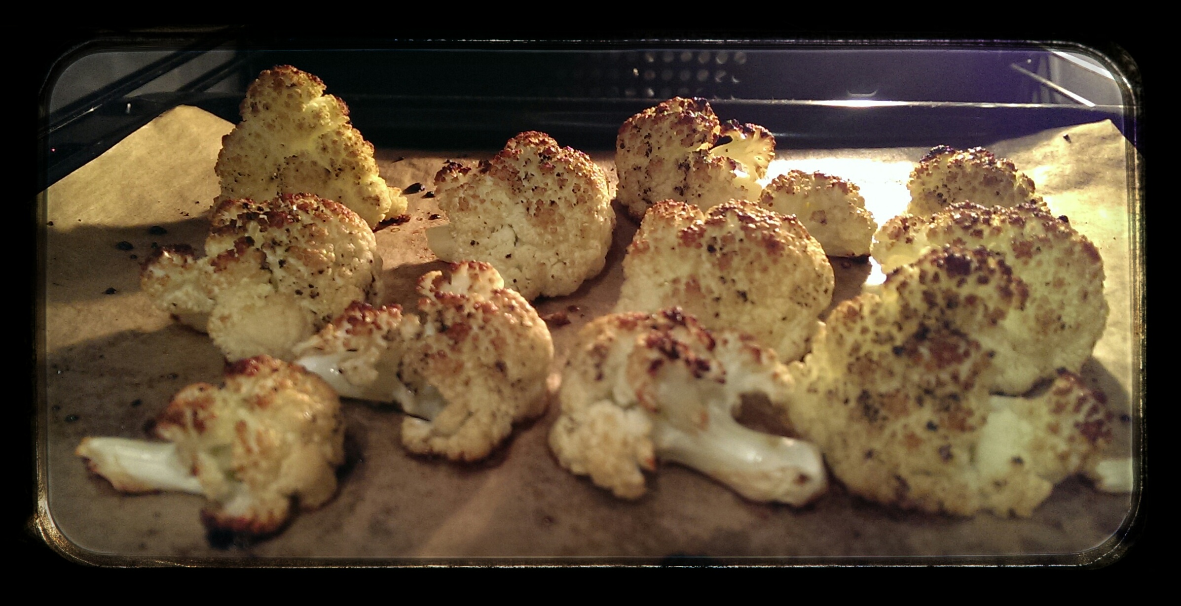 1 eher kleinerer Blumenkohl in kleine Röschen zerteilen, auf einem mit Backpapier ausgelegtem Backblech verteilen und mit einer Mischung aus