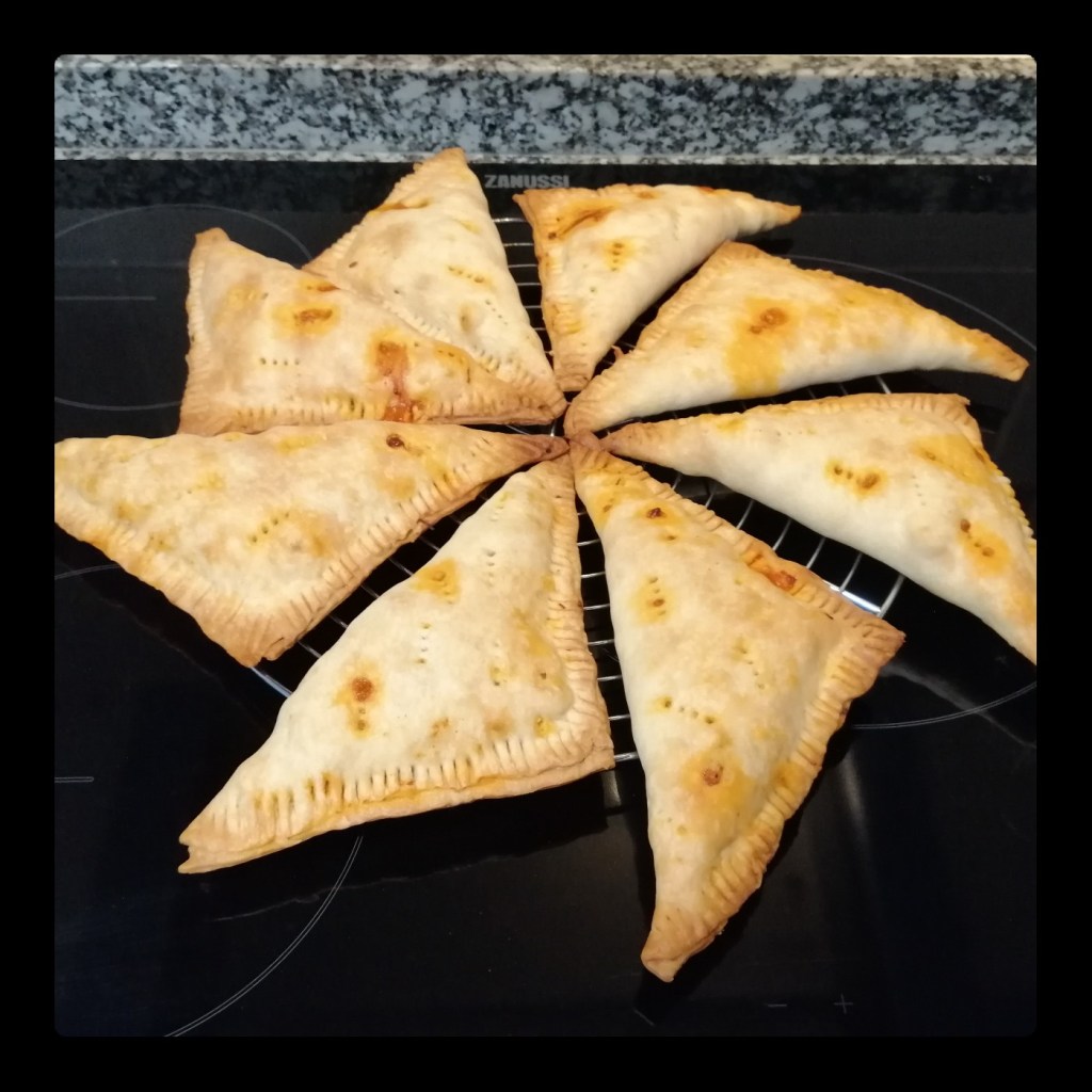 460 g Empanada-Teig (Fertigprodukt aus der Kühltheke) in 8 Quadrate teilen und die Hühnchen-Mischung darauf verteilen, die Ränder des Teigs mit Wasser befeuchten und die Quadrate zu Dreiecken zusammenklappen, die Ränder mit einer Gabel aneinanderdrücken, die Empanadas mit