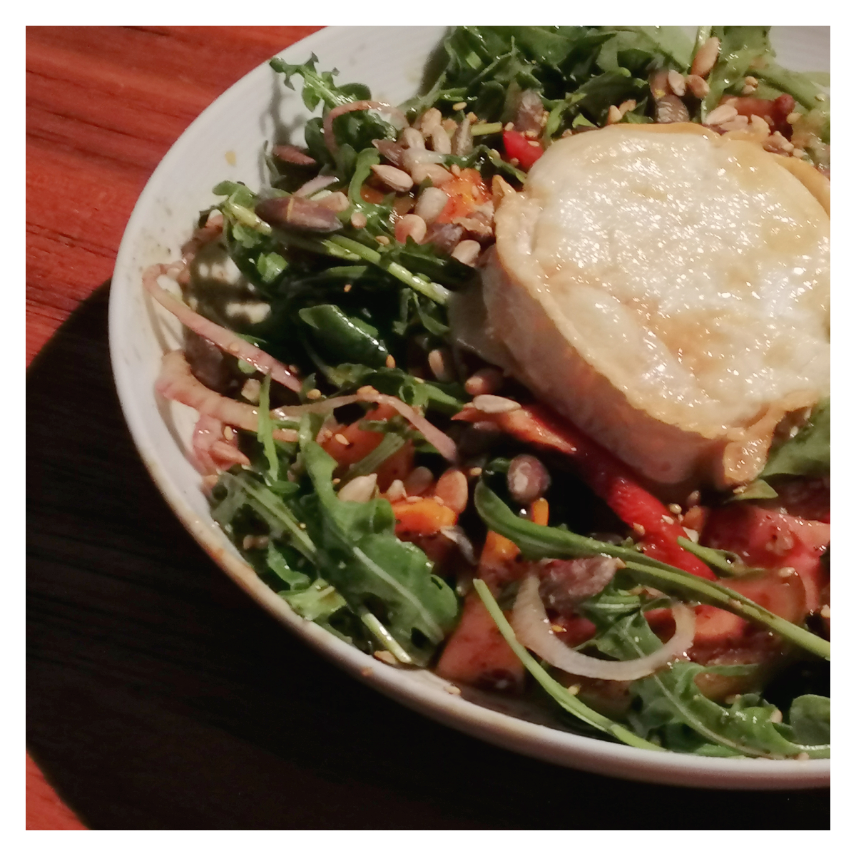 Backpapier auf dem Rost direkt unter den Grill schieben, ca. 2 Min. gratinieren und dann den Käse in die Mitte des Salates setzen