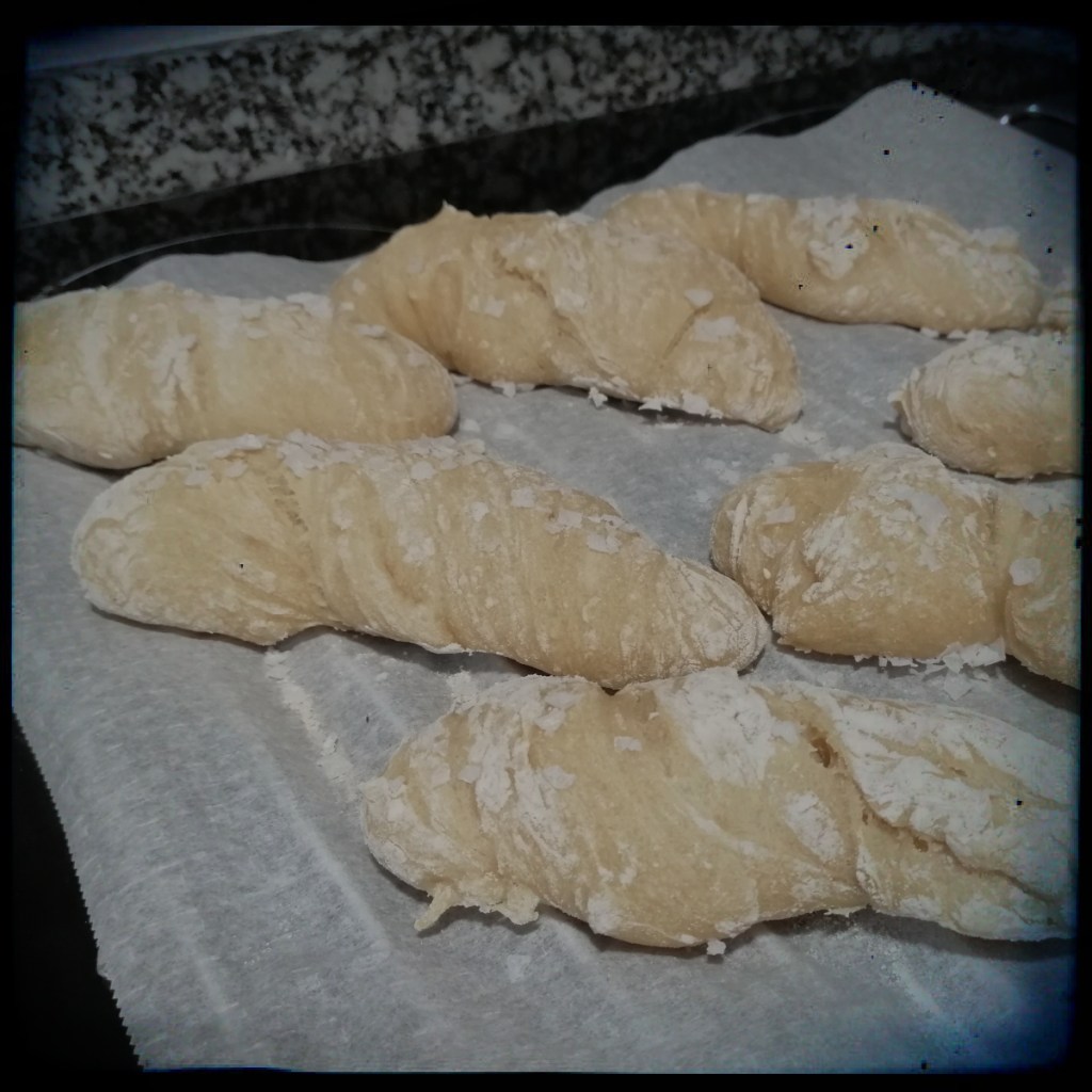 weiterem Dinkelmehl in acht Portionen teilen, die Portionen zu länglichen Laiben formen, die Laibe einmal ineinander verwinden und auf ein mit