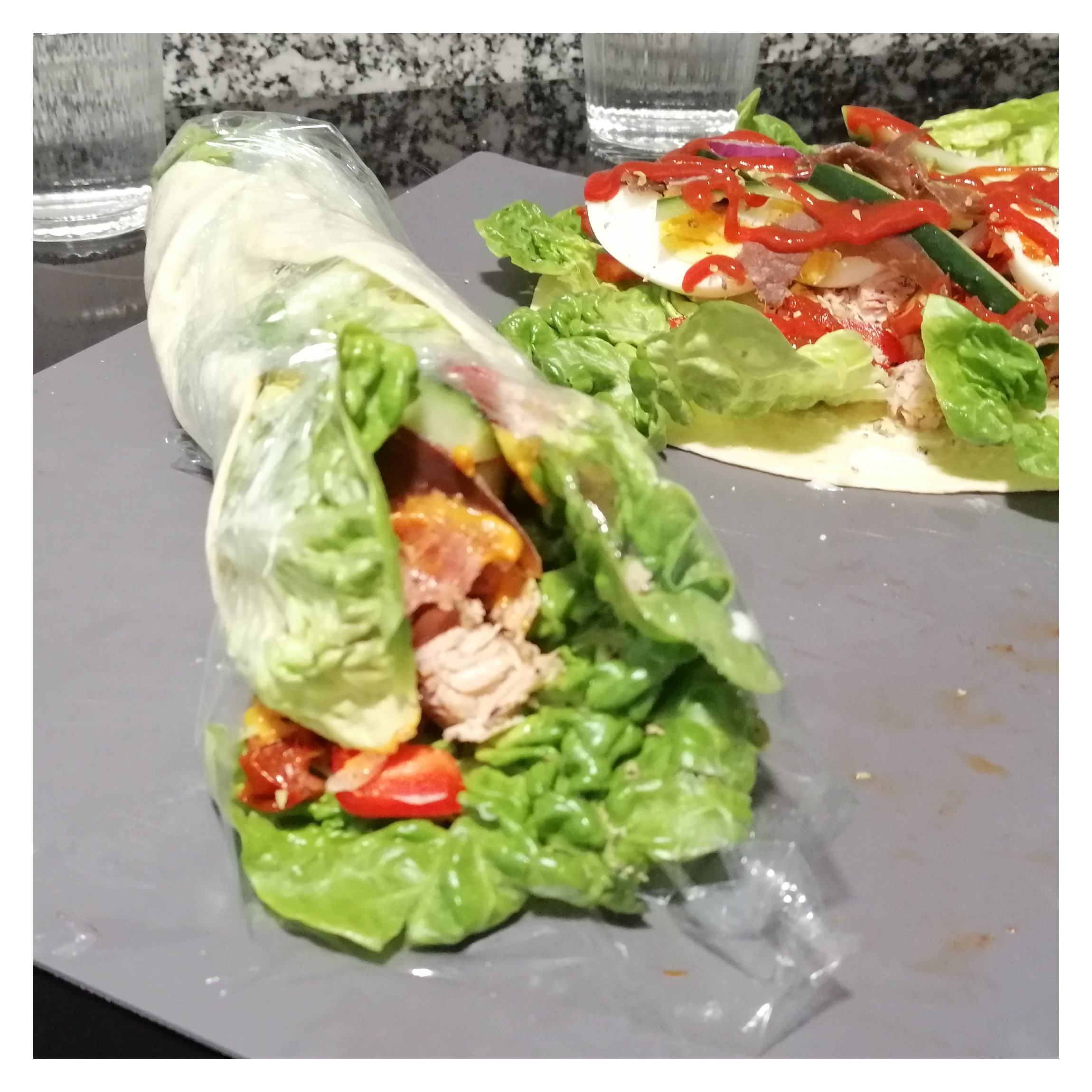 frisch gemahlenem schwarzen Pfeffer würzen, zu einem Wrap fest zusammenrollen und in
