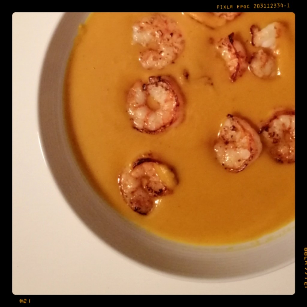 die Suppe in zwei vorgewärmte Teller füllen, und die Garnelen darauf geben