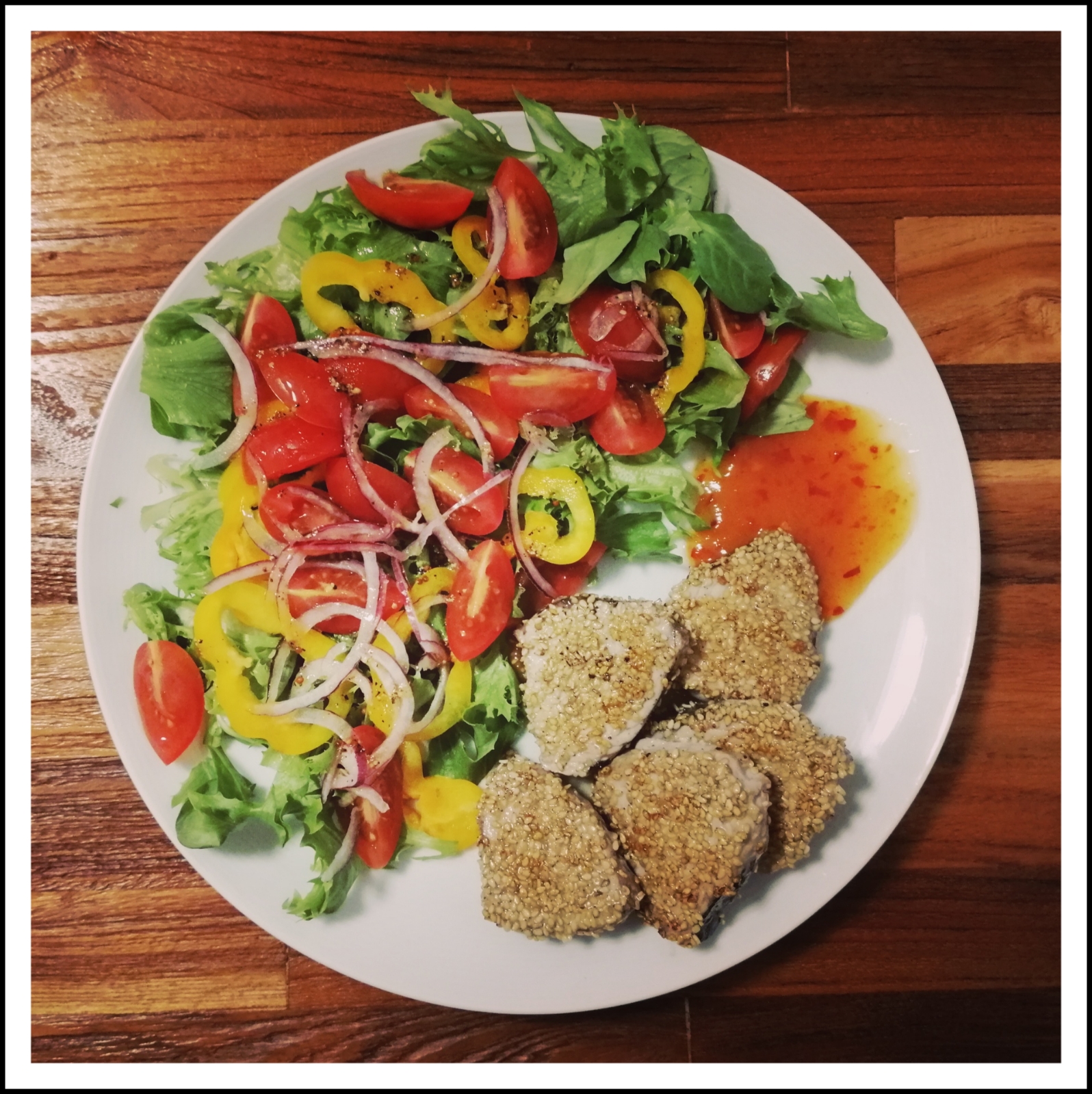 die Bonito-Filets zum Salat auf den Teller geben und z. B. mit Mango-Chutney oder einer dicken Zitronenscheibe servieren