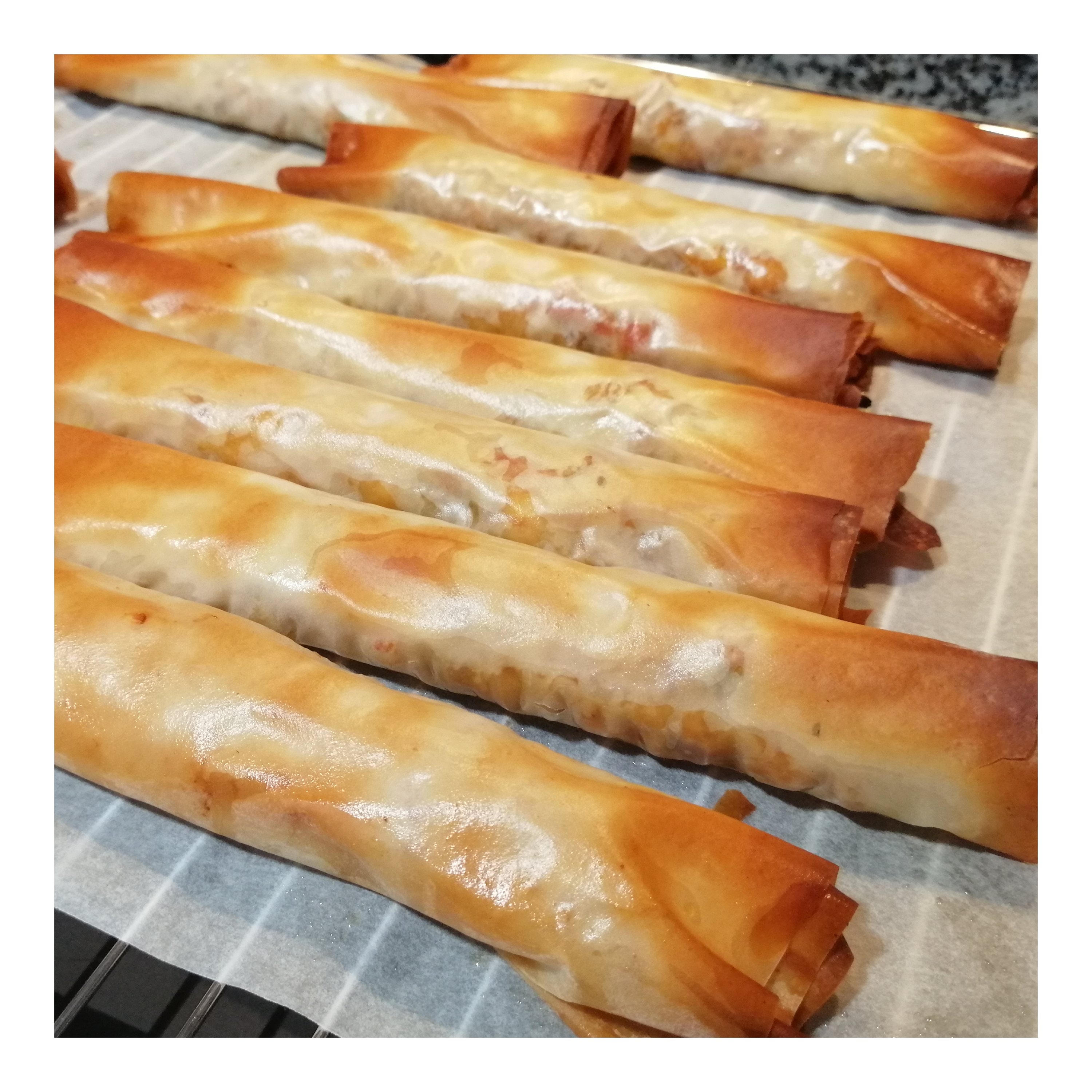 250 g Filoteig (5 Stücke – Fertigprodukt, aus dem Kühlregal) in 10 Stücke teilen (also die einzelnen Filoplatten quer halbieren) und je 1/10 der Gemüse-Fischmischung jeweils an einem Ende der kurzen Seite der Filoplatten längs verteilen, dann die Gemüsemischung in die Filoteigstücke fest einrollen, anschließend die Enden der Flautas leicht zusammendrücken, die Flautas auf ein mit