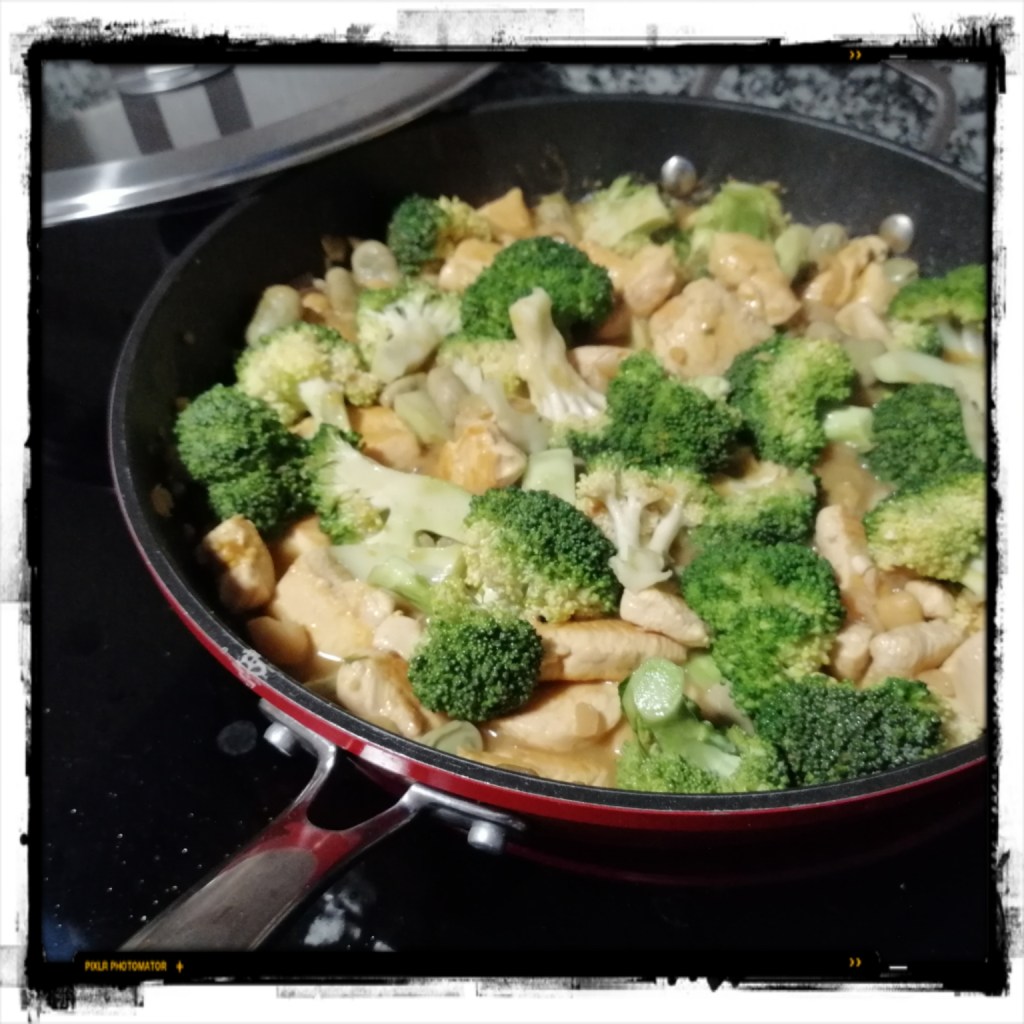 300 g Kokosmilch zum Zwiebelmix geben und einmal kurz aufkochen lassen, dann die Fleischstücke hinzugeben und bei milder Hitze noch etwa 3 Min. ziehen lassen, zum Schluss den Brokkoli unterheben und unter dem Deckel noch kurz erneut erwärmen ggf. noch mit