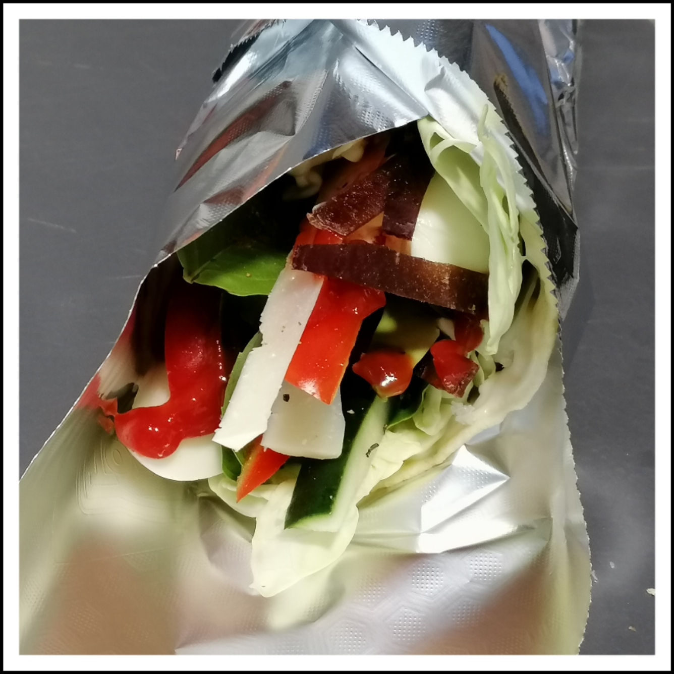frisch gemahlenem schwarzen Pfeffer würzen, zu einem Wrap fest zusammenrollen und in