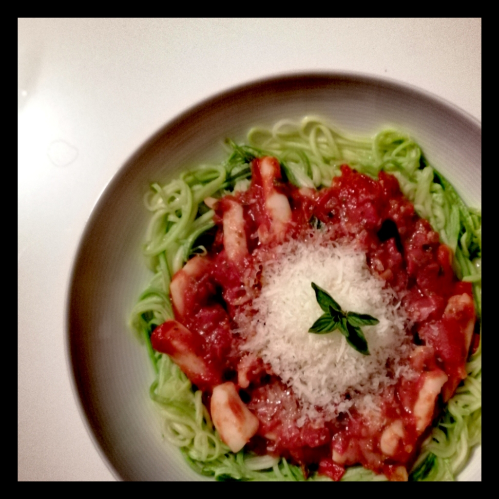 1 kleineren Calabacin (ca. 350 g – ersatzweise Zucchini) ca. 200 g Spaghetti abschälen (das Kern-Innenleben dabei nicht mit verarbeiten) und die Blättchen von