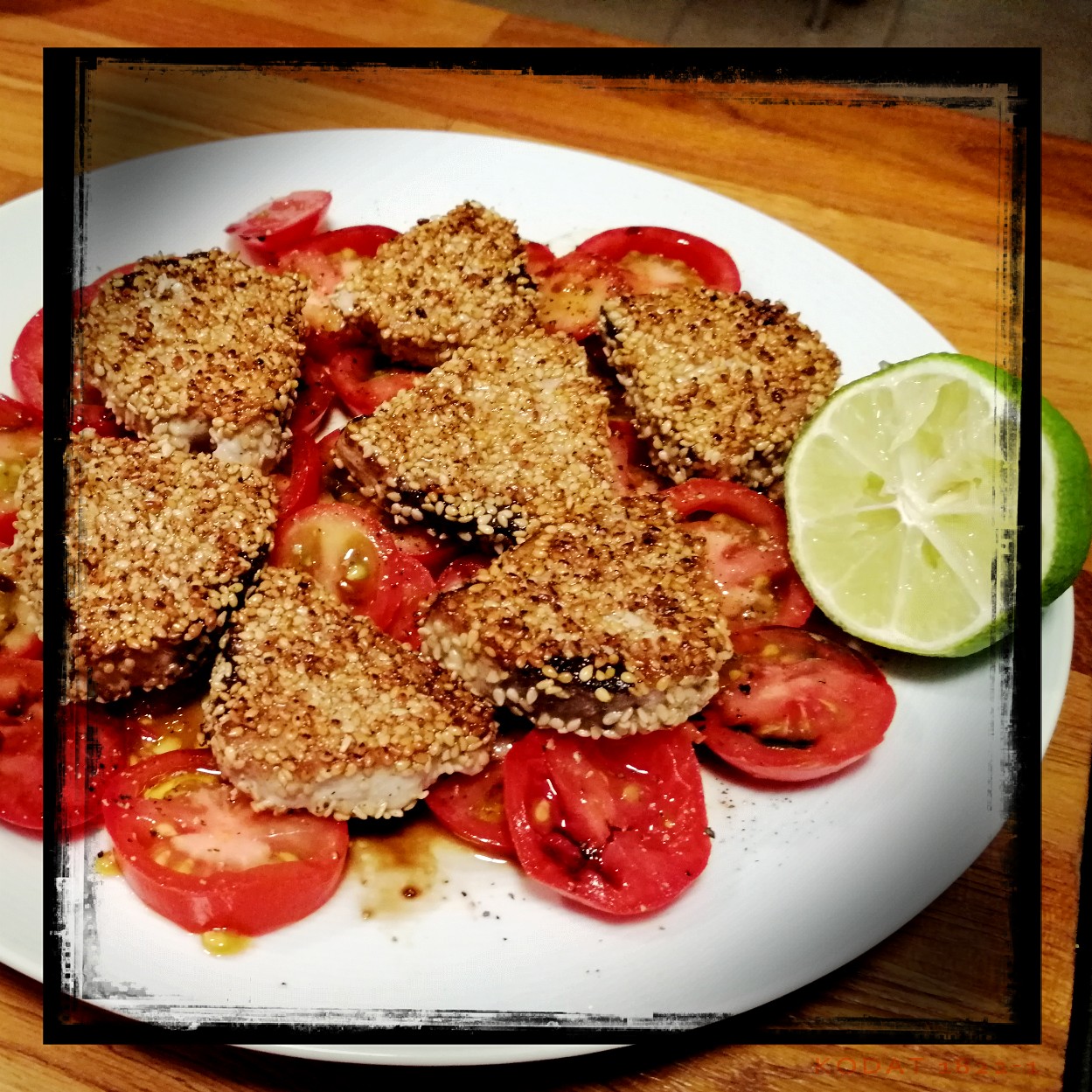 180 g Bonito-Filet (ersatzweise Tunfischfilet) in Scheiben von ca. 1,5 cm Dicke schneiden, von beiden Seiten mit
