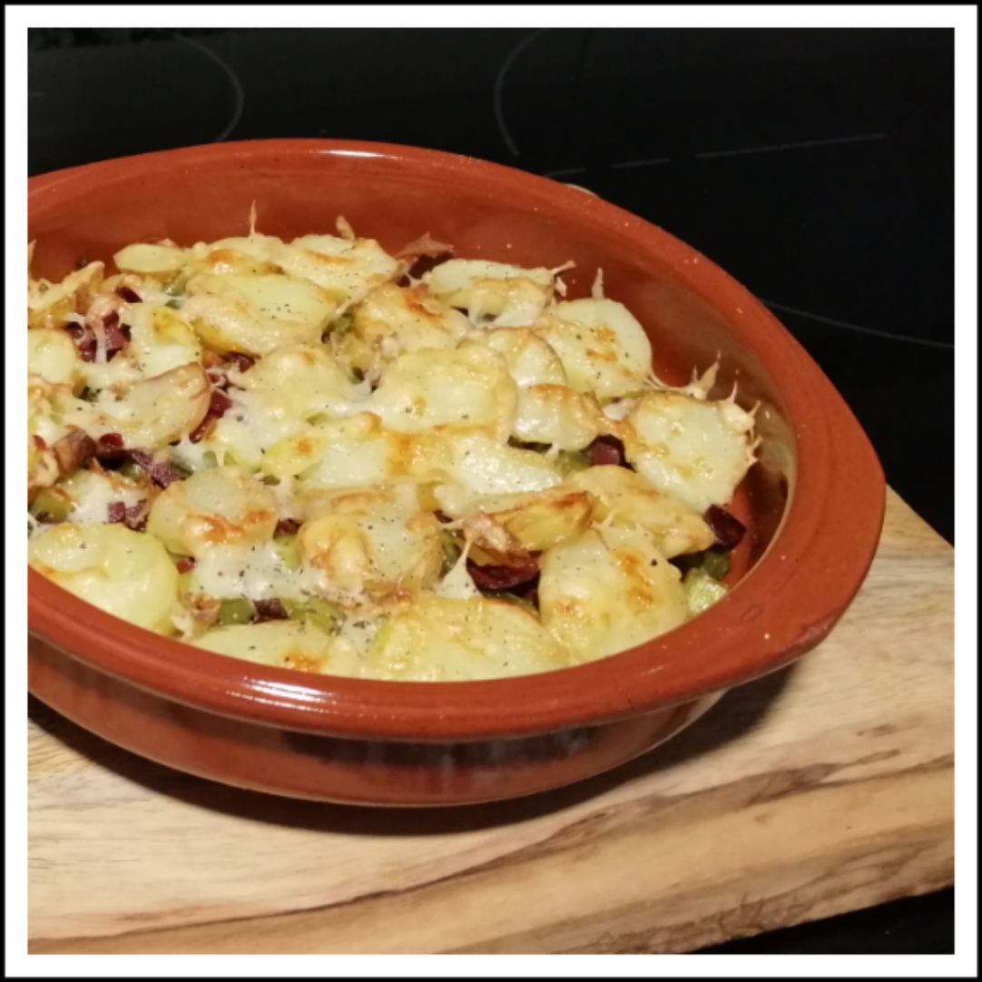 1 TL Butter einfetten, zuerst eine Schicht Kartoffelscheiben, dann die Hälfte des Rinderrauchfleischs, den Lauch, die 2. Hälfte Rinderrauchfleisch und zum Schluss die 2. Schicht Kartoffelscheiben hineingeben, alles mit dem Käse bestreuen und