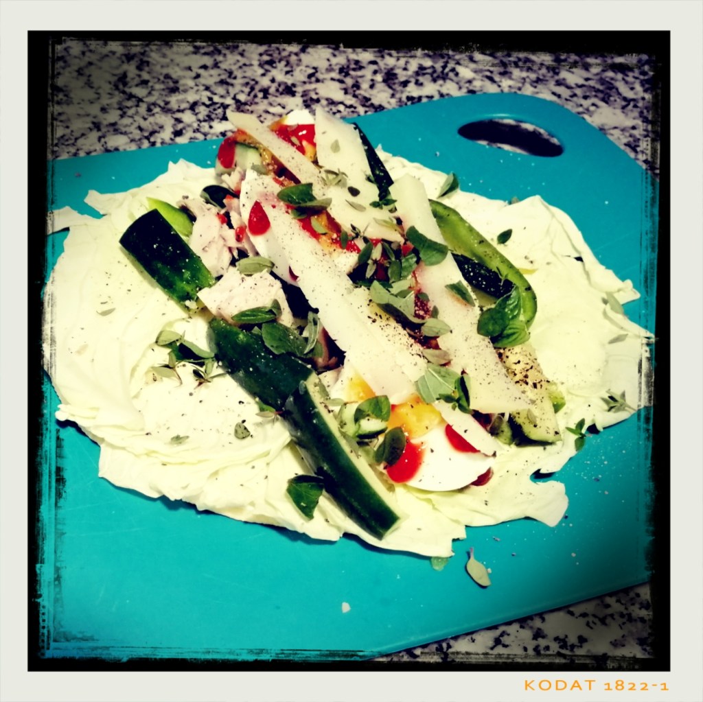einigen Blättern Weißkohl komplett auslegen, dann mit den zerstückelten Tunfischfilet,