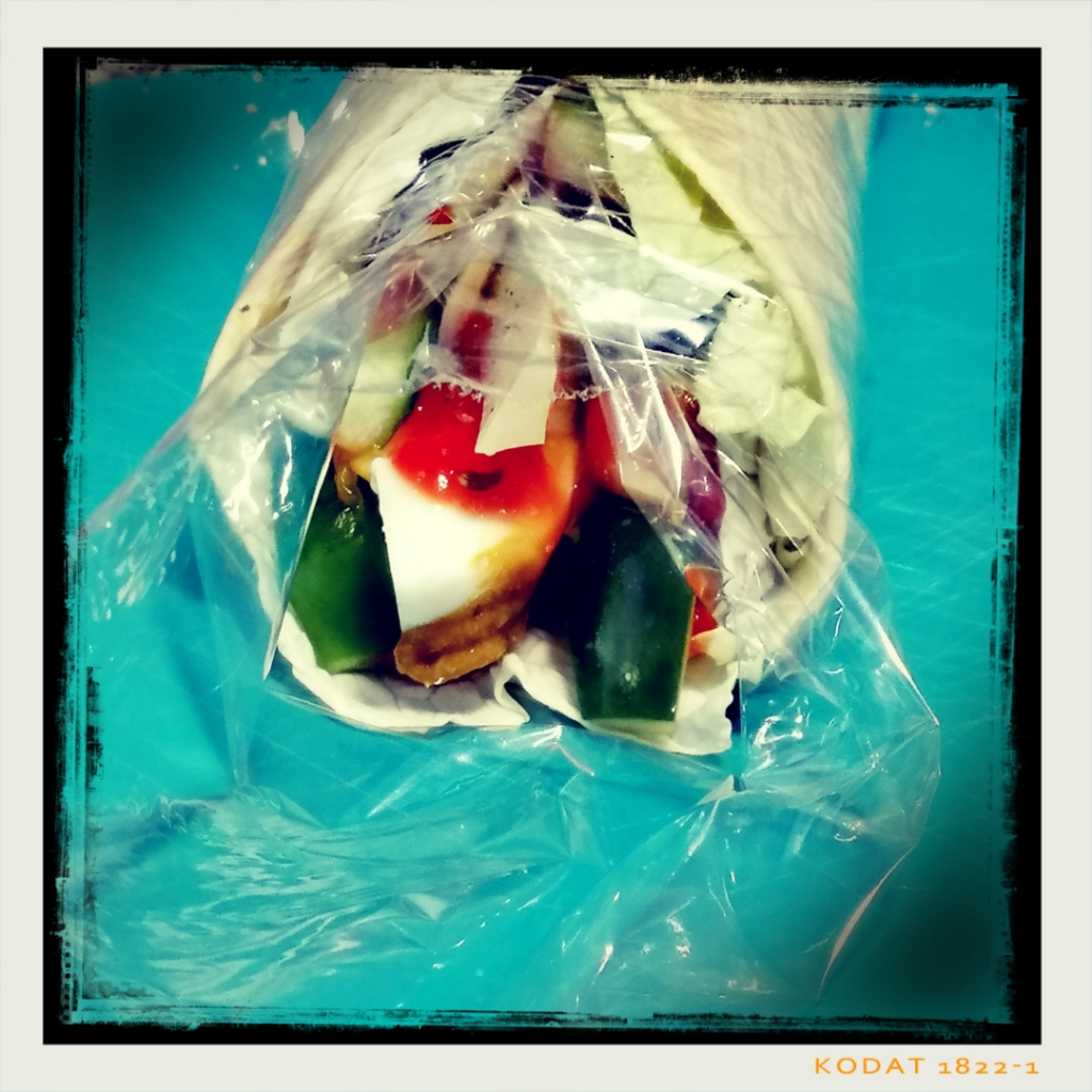 Frischhaltefolie (oder wenn man ihn sofort isst: Pergamentpapier) wickeln