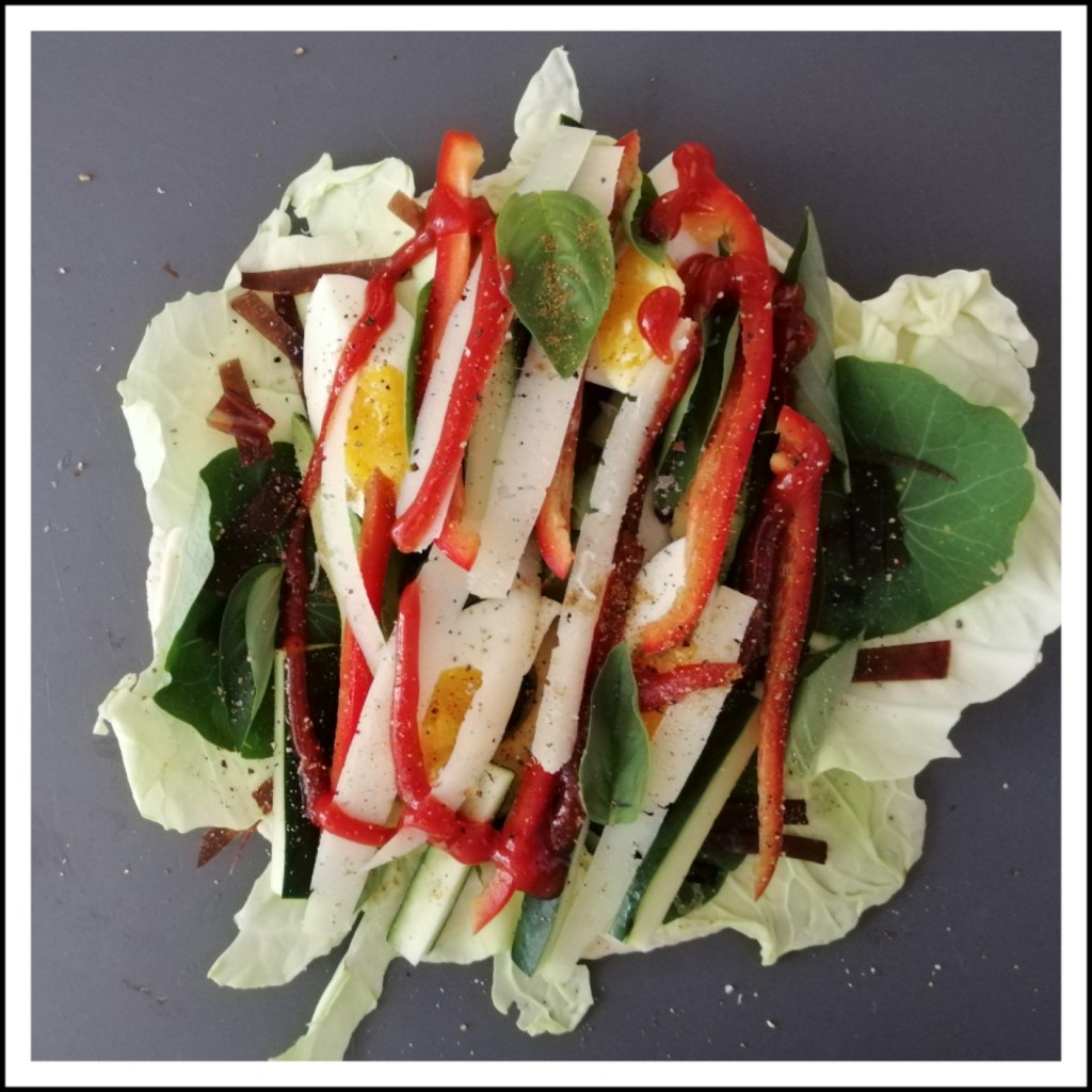1/6 roter Paprika (ca. 25 g – in dünne Streifen geschnitten), dem längs geviertelten Ei,
