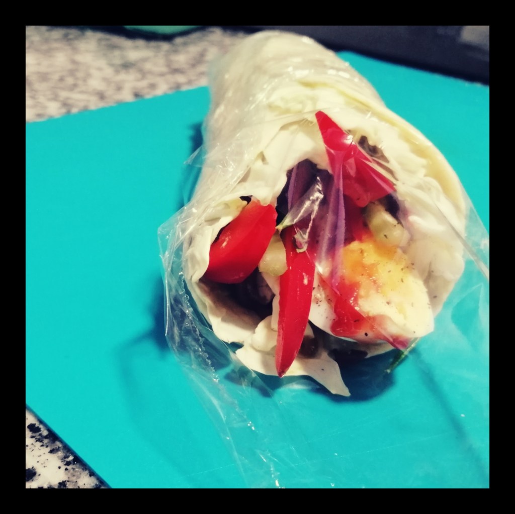 Frischhaltefolie (oder wenn man ihn sofort isst: Pergamentpapier) wickeln