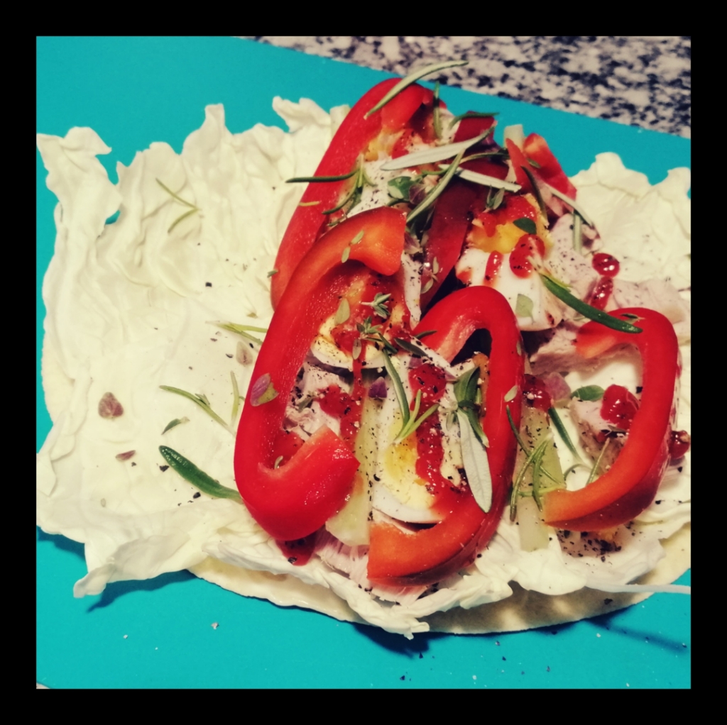 einigen Blättern Weißkohl komplett auslegen, dann mit dem Tunfischfilet (in kleine Stücke zerteilt), dem längs geviertelten Ei,