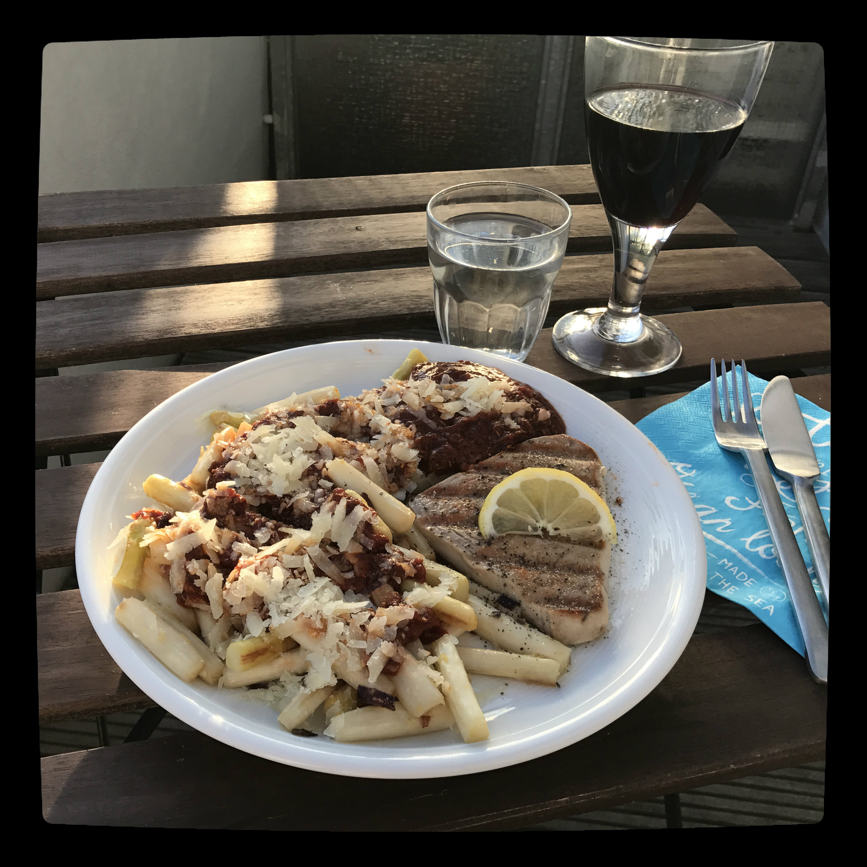 Spargel und Tunfischsteak auf einen vorgewärmten Teller geben, die Tomatensauce darauf verteilen und mit dem Pecorino bestreuen