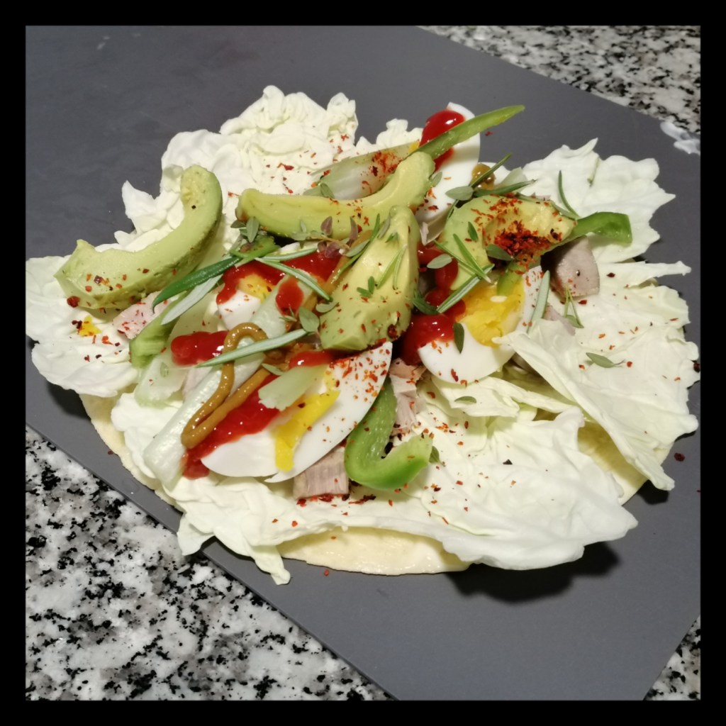 einigen Blättern Weißkohl komplett auslegen, dann mit dem Tunfischfilet (in kleine Stücke zerteilt), dem längs geviertelten Ei,